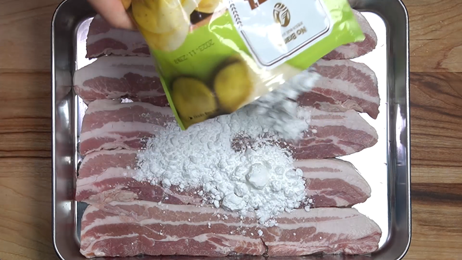 2. 삼겹살 위에 감자전분을 뿌려 앞뒤로 골고루 묻혀준다.