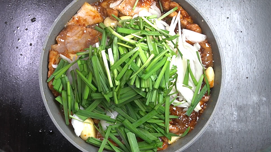 6. 삼겹살에 어느정도 양념이 베이면 양파 1/2개와 부추 한 줌정도를 넣어준 뒤 살짝 볶아준다.