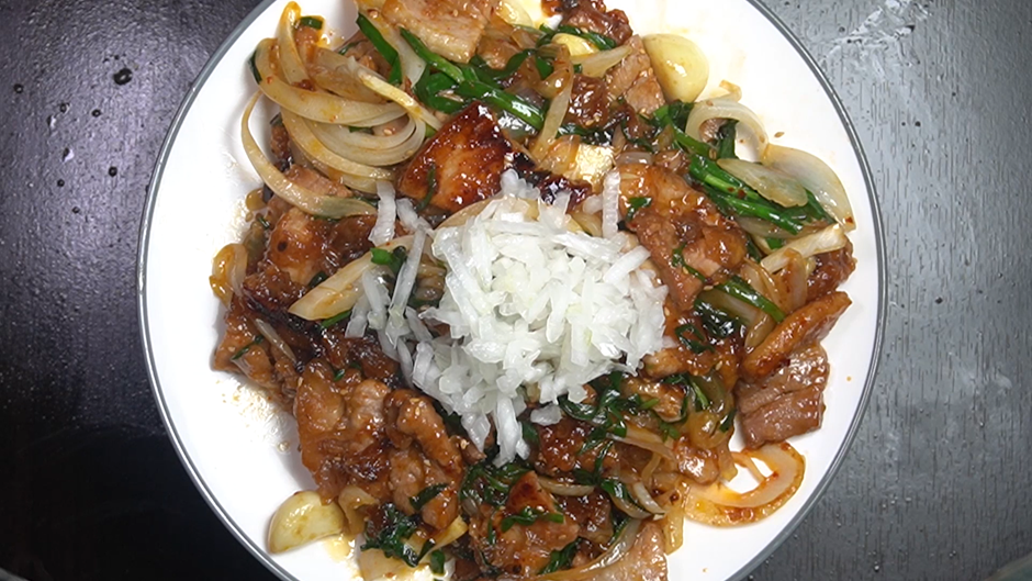 8. 접시에 완성된 간장 삼겹살 조림을 옮겨담은 뒤 곁들여 먹으면 아주 맛있는 생양파 한 줌 정도를 다져서 올려준다.