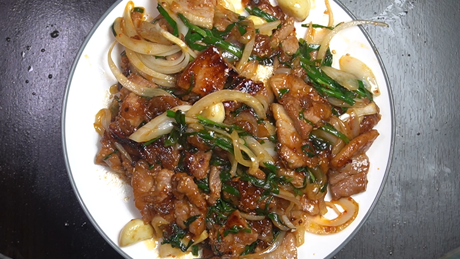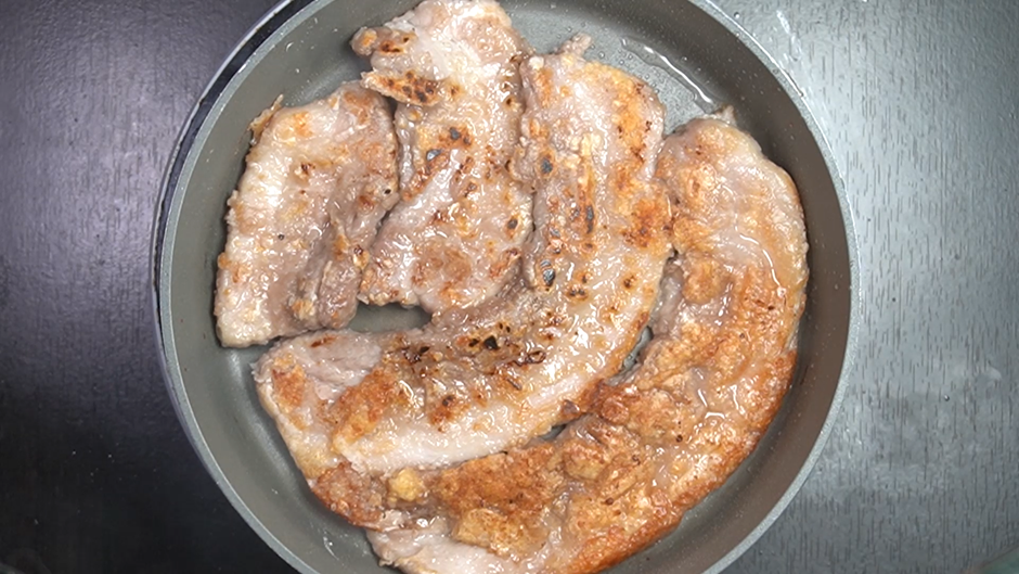3. 팬에 식용유 2숟가락을 넣은 뒤 삼겹살을 앞뒤로 노릇하게 구워준다.