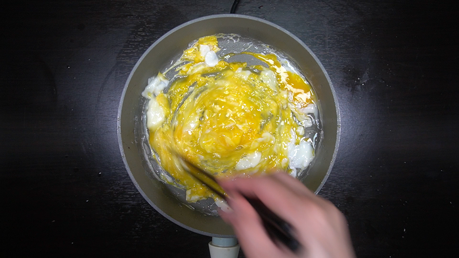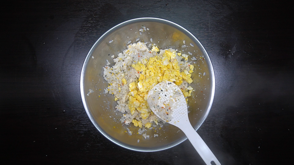 * 계란 3개는 후라이팬에 기름을 살짝 두른 뒤 계란 3개를 넣고 잘 휘저어 스크램블을 만들어 넣는다.
