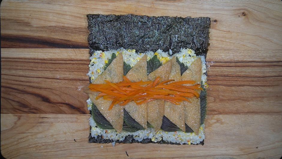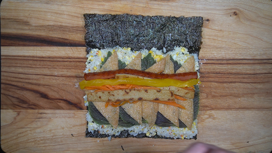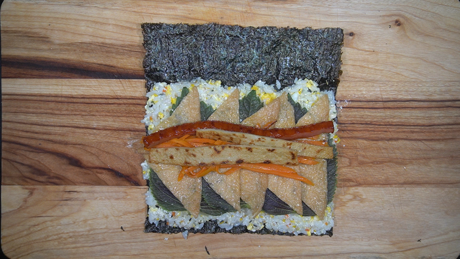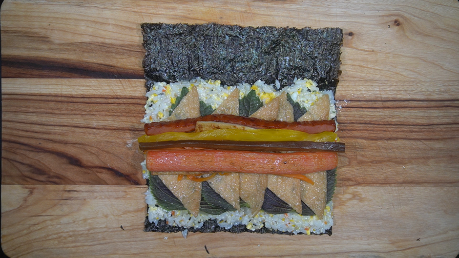 1. 김밥용 김에 밑간한 밥을 넓게 편 뒤 아래의 재료를 올려 잘 말아준다.