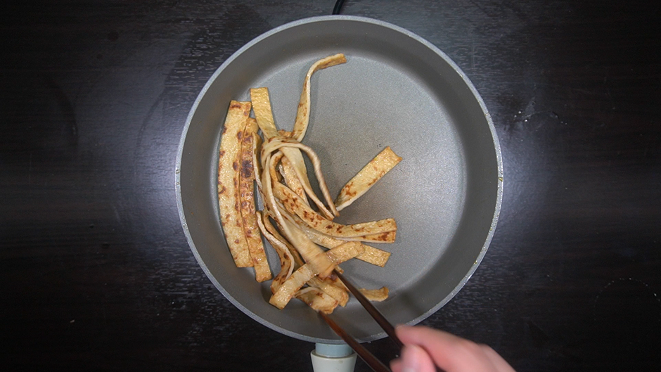 * 사각어묵을 길쭉하게 썰어준 뒤 마른 팬에 한번 볶아 넣어준다.