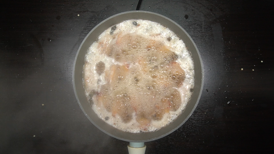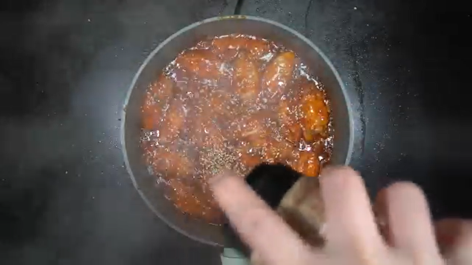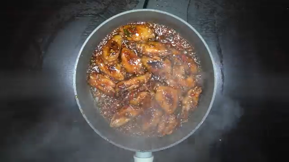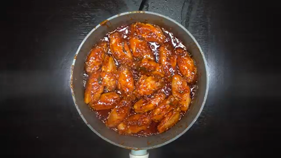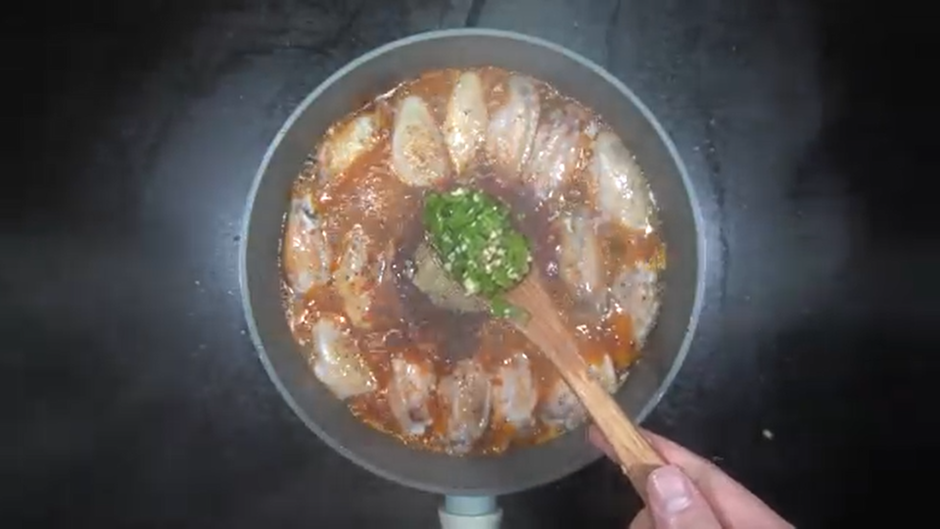 3. 노릇하게 구워진 닭날개에 후라이팬에 그대로 아래의 재료를 넣어 양념해준다.
