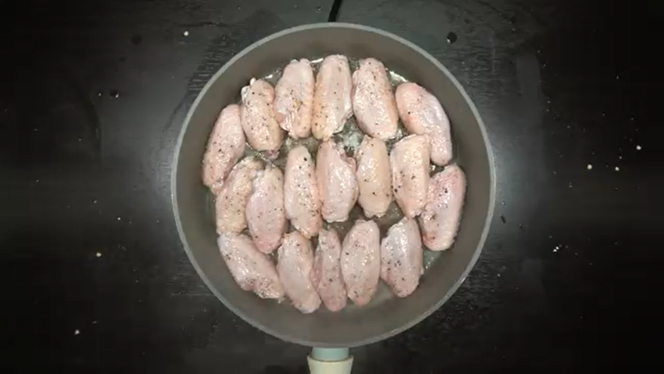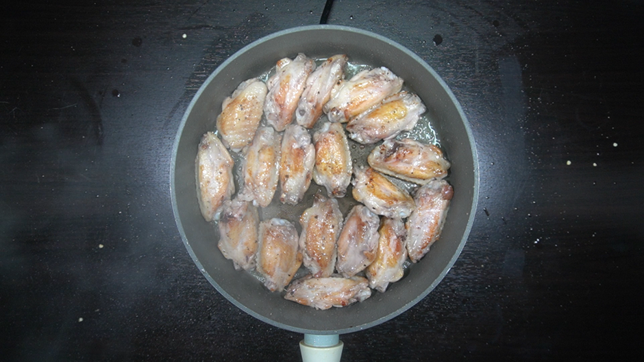 2. 후라이팬에 식용유 5숟가락을 두른 뒤 밑간한 닭날개를 앞뒤로 노릇하게 구워준다.