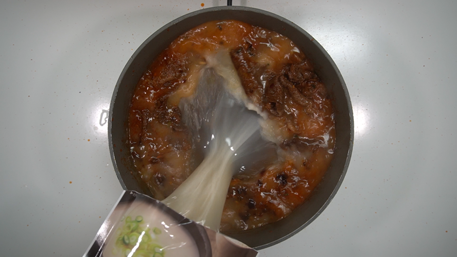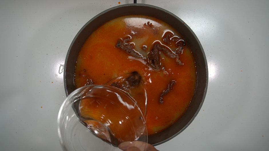 2. 고기가 완전히 볶아졌다면, 시판용 사골육수 500ml와 물 80ml를 부어준다.