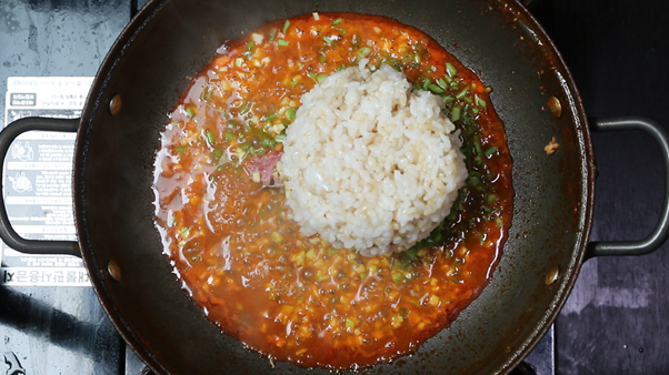 7. 국물의 수분이 반 이상 졸았다면 계란 1개를 넣고 밥과 함께 잘 섞어준다.