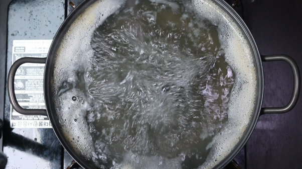 2. 2L의 멸치육수가 약 1.5L 정도로 줄면 멸치, 다시마, 청양고추를 모두 건져준다.