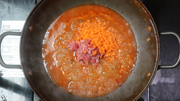 5. 준비한 샤브샤브용 고기 300g을 식후죽(볶음밥)에 넣을 정도(약 1/2컵)만 빼놓고 나머지 모두 넣어준다.
