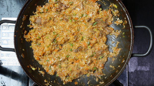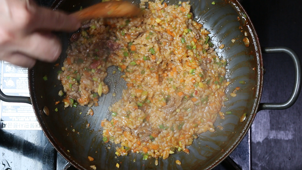 수분이 적어 밥과 채소가 눌러붙지 않도록 약불에서 끊임없이 저어주어야 한다.