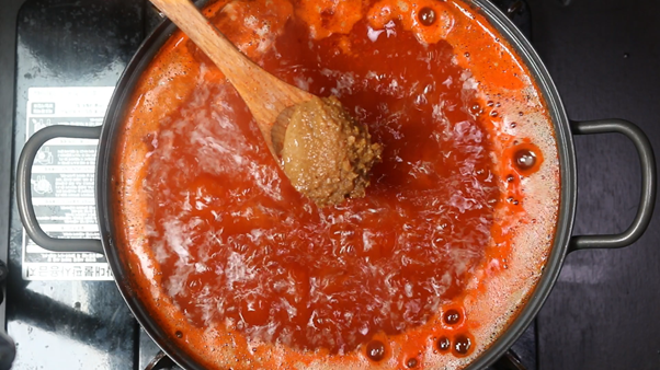 3. 끓는 육수에 고춧가루 4숟가락, 고추장 2숟가락, 된장 1숟가락, 국간장 3숟가락, 맛술 1숟가락, 다진마늘 2숟가락, 소고기 다시다 1숟가락, 미원 1/3숟가락을 넣고 양념이 잘 섞이도록 저어가며 풀어준다.
