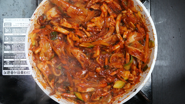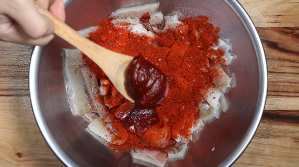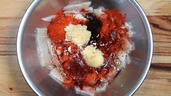 한번에 넣으면 요리 초심자들에게는 시간적으로 부담이 되어 결국 요리가 지연되면 맛있게 만들 수 없다. 큰 볼에 절단된 오징어를 넣고 아래의 순서에 따라 양념을 넣은 후 잘 버무려준다.