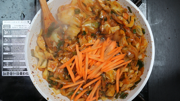 또한 양파, 양배추, 대파는 숨을 완전히 죽여서 양념이 나중에 들어가면 형체를 알아볼 수 없게 강불에서 볶아준다. 이 채소들은 나중에 밥에 비벼먹을 때 밥알 사이사이에 양파 양배추가 으스러지면서 꾸덕한 소스가 되게끔 해주는 역할을 하게된다.
