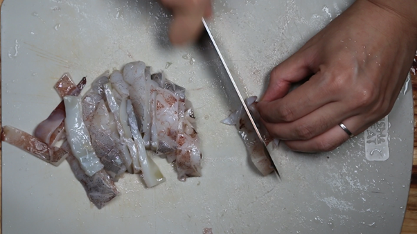 1-6. 오징어 몸통부분도 깨끗한 물에서 박박 씻은 후 사선으로 칼집을 내준 후 일정 크기로 잘라준다. 사선으로 칼집을 넣으면 익었을 때 오징어가 활짝 펴져 먹음직스럽게 보일 뿐만 아니라 빨간 양념이 칼집 사이로 들어가 양념이 더욱 잘 베는 효과가 있다. 칼질이 부담스럽거나 귀찮으면 사선 칼집내는 과정은 생략해도 OK