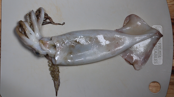 1-2. 가위를 이용하여(혹은 칼 등을 이용하여) 오징어 배를 반으로 갈라 배를 연다. 그 후 배 안, 내장 뒤쪽의 투명 심지도 함께 제거해준다.
