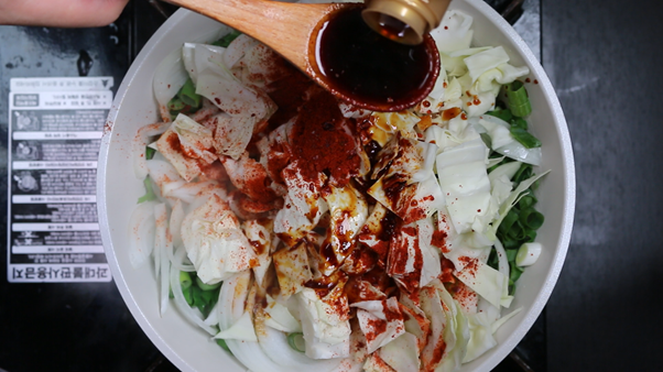 4. 채소가 익기 전에 바로 고춧가루 2숟가락, 진간장 3숟가락을 넣어 채소와 버무려주며 양념을 해준다. 채소에 양념을 따로 하는 이유는 고춧가루가 파기름을 만나서 감칠맛 있는 고추기름이 만들어게 되고 간장 또한 기름과 만나 더욱 풍미가 살아나게 된다.