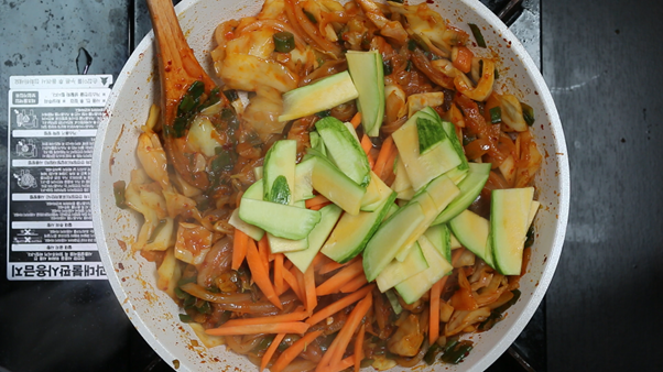 5. 채소가 익어 숨이 죽으면 썰어둔 애호박 1/3개, 당근 1/4개를 넣는다. 애호박과 당근은 나중에 넣어서 최대한 식감과 모양을 살려준다.