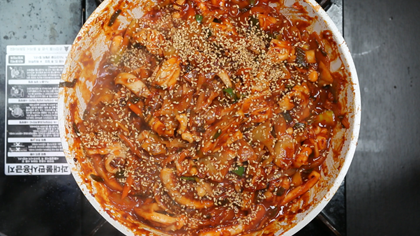 9. 오징어가 다 익었으면 불을 끄고 통깨를 뿌려 마무리한다.