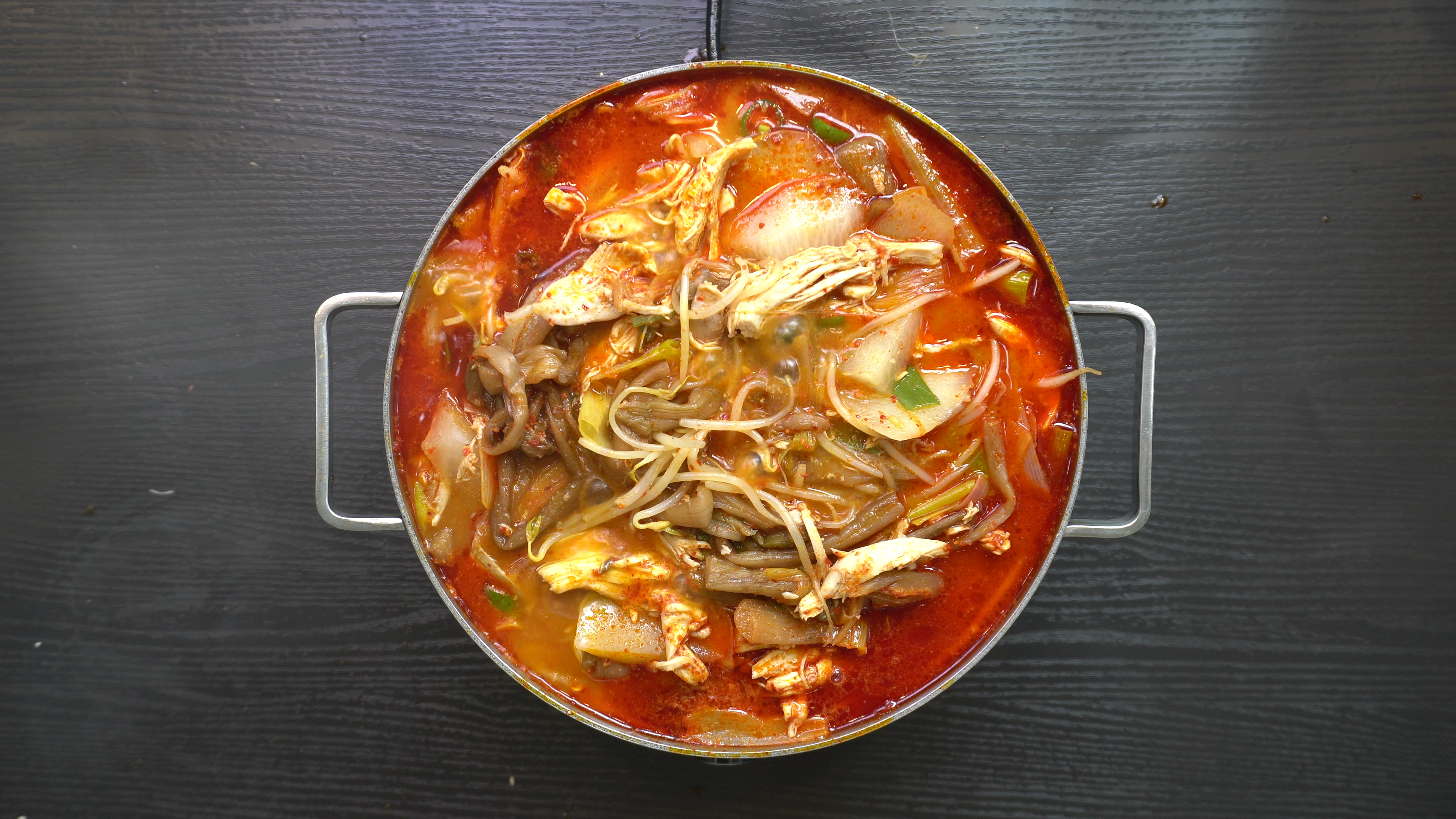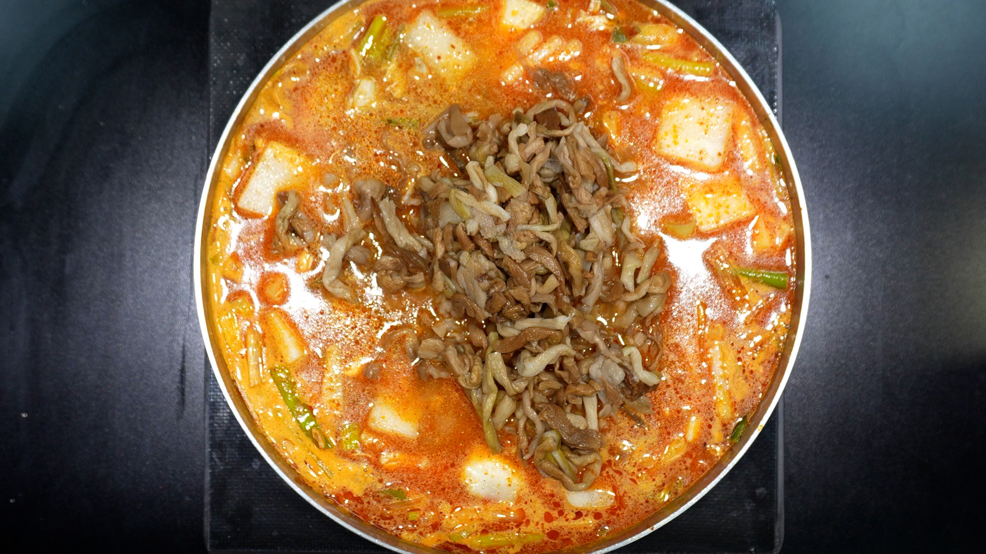 7. 팬에 닭을 끓이던 육수를 붓고 아래 재료를 넣고 끓이면 완성