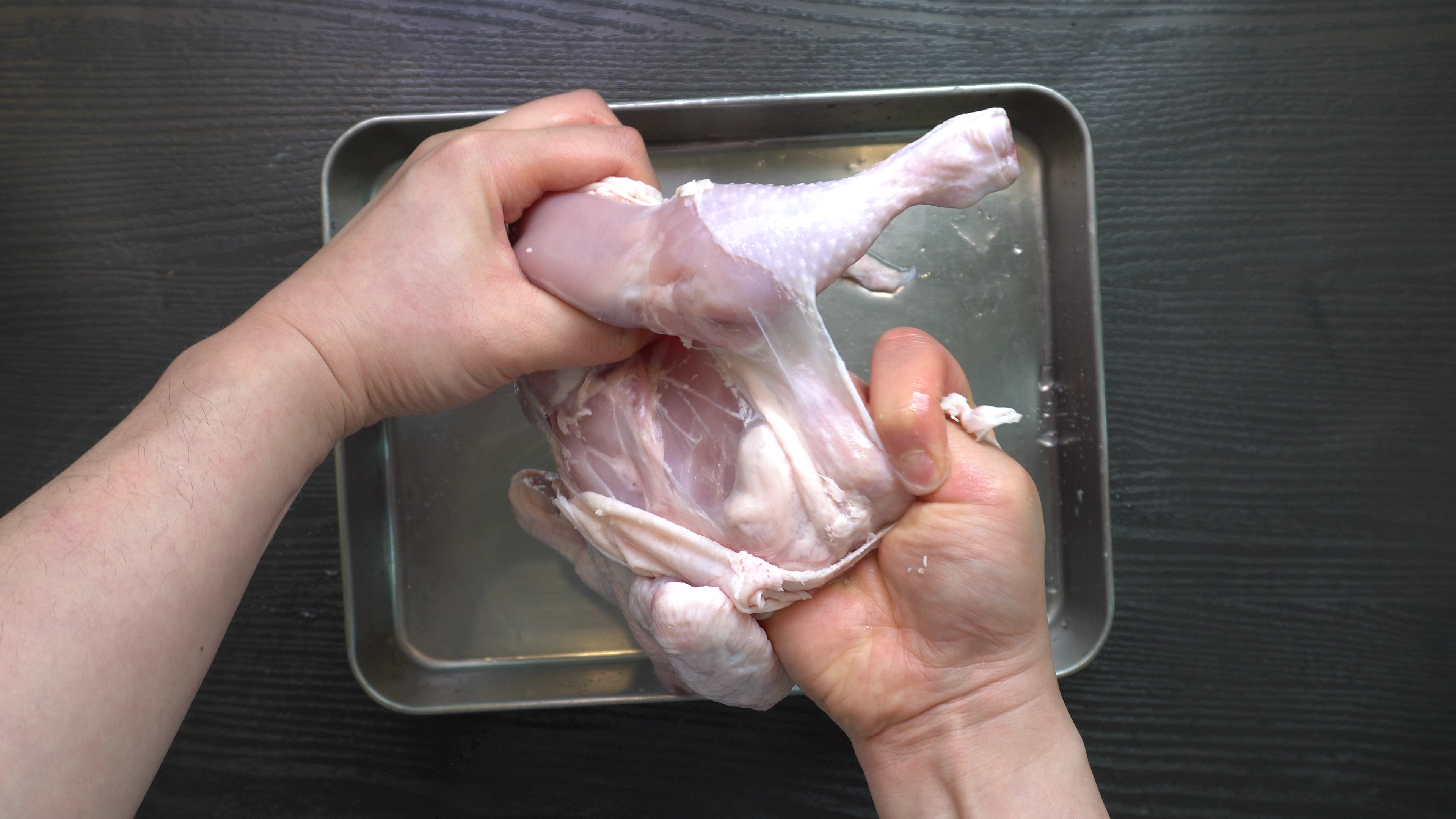 1. 닭의 껍질을 벗긴 후 날개 끝과 꽁지 부분을 자른다.
