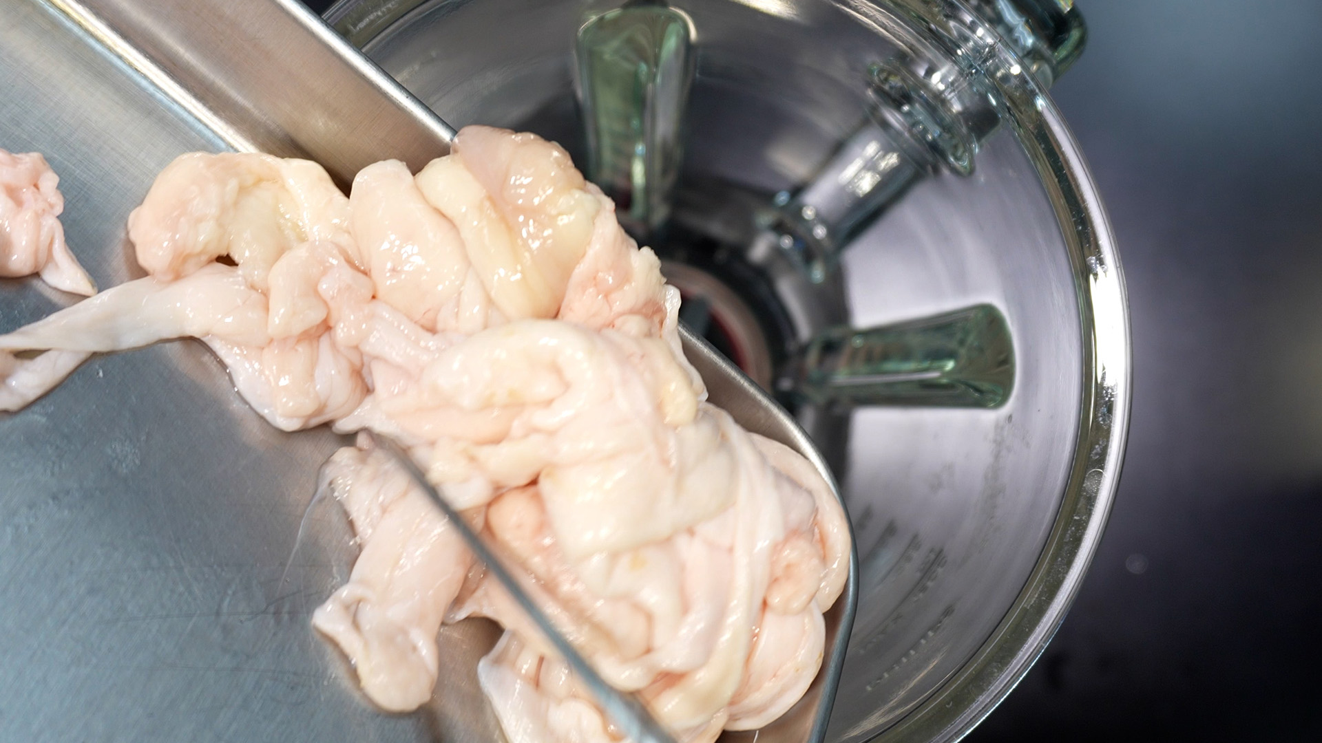 1) 믹서기에 닭껍질을 넣는다.