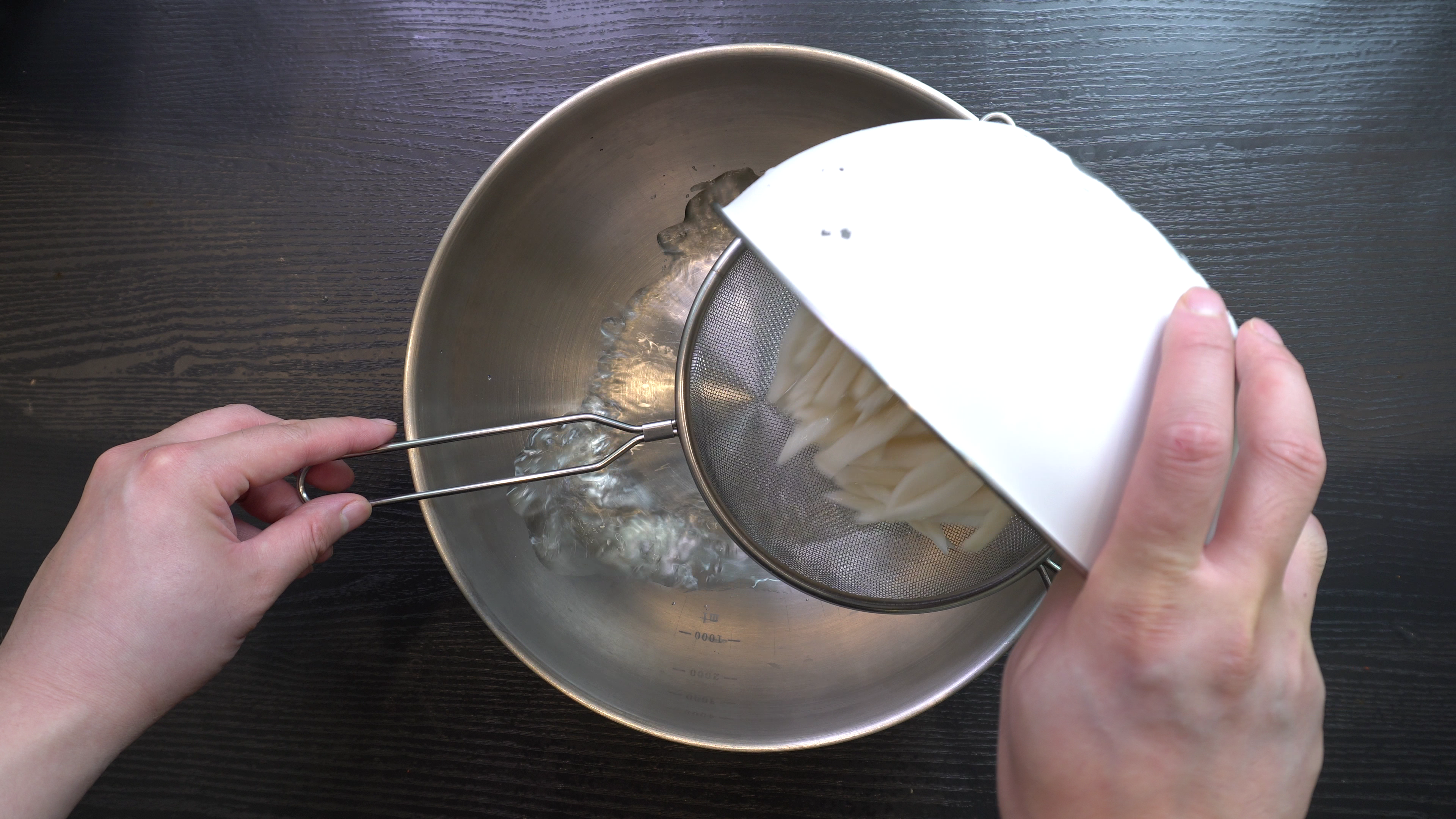 2. 3시간 뒤 무에서 나온 물은 걸러주고 아래의 재료를 넣고 양념을 한다.