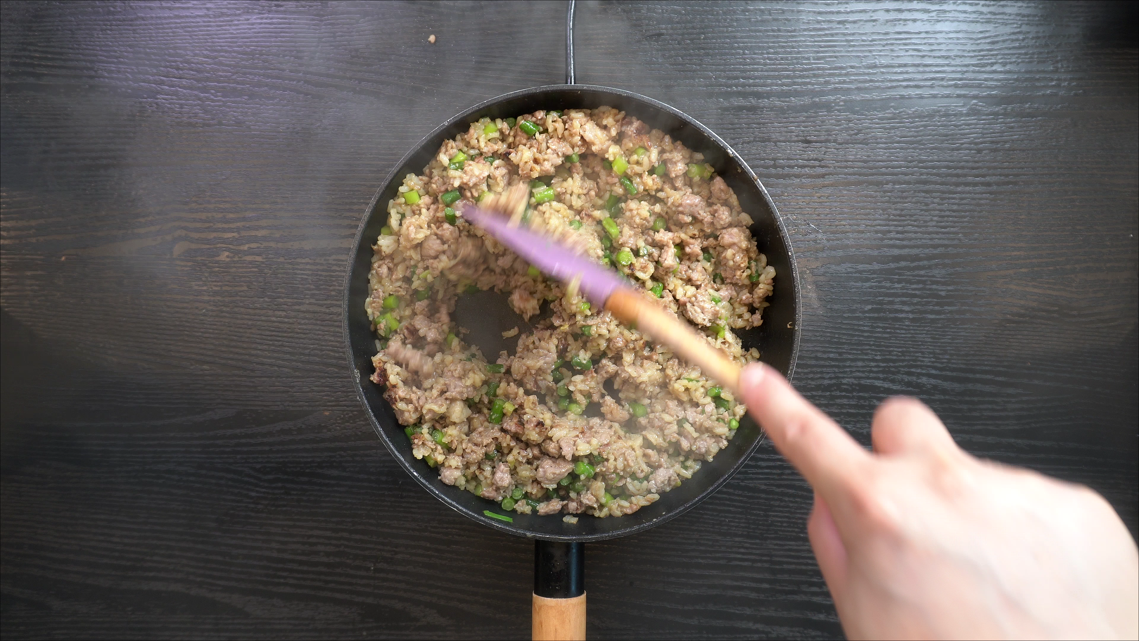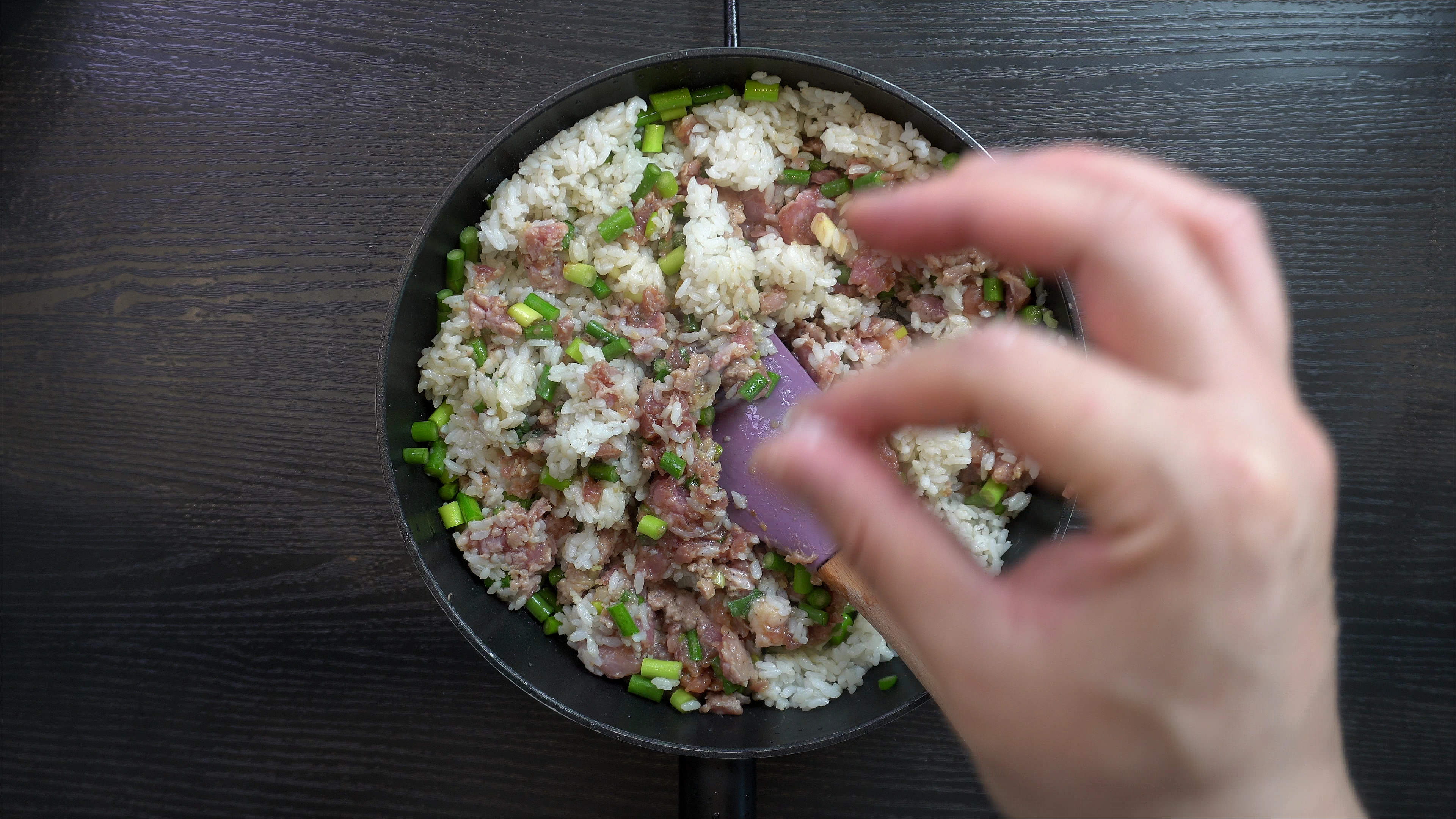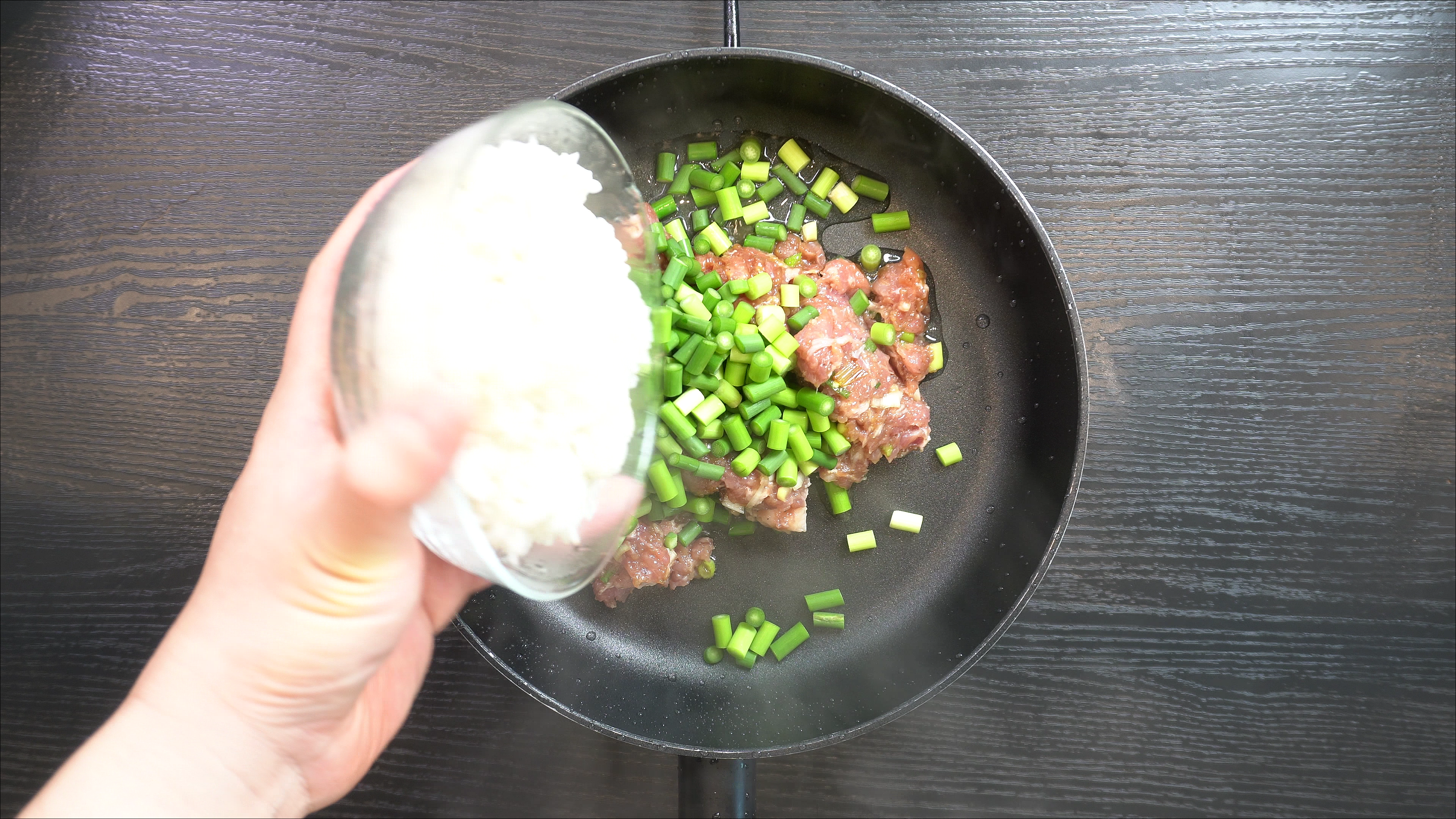 1. 팬에 아래의 재료를 넣고 볶아주면 초간단 마늘쫑볶음밥 완성!