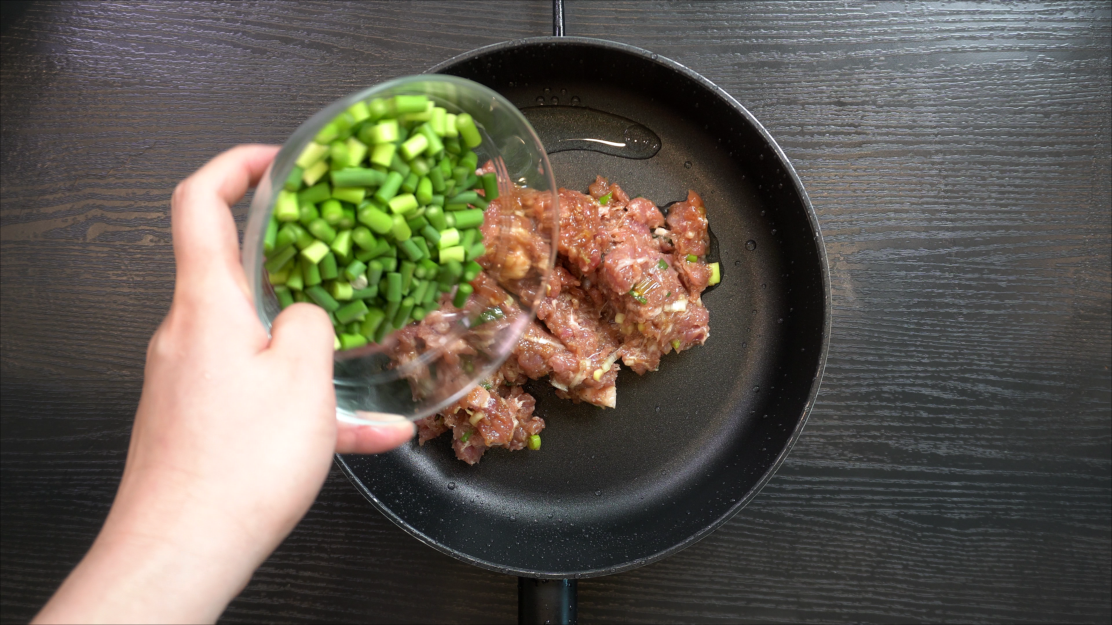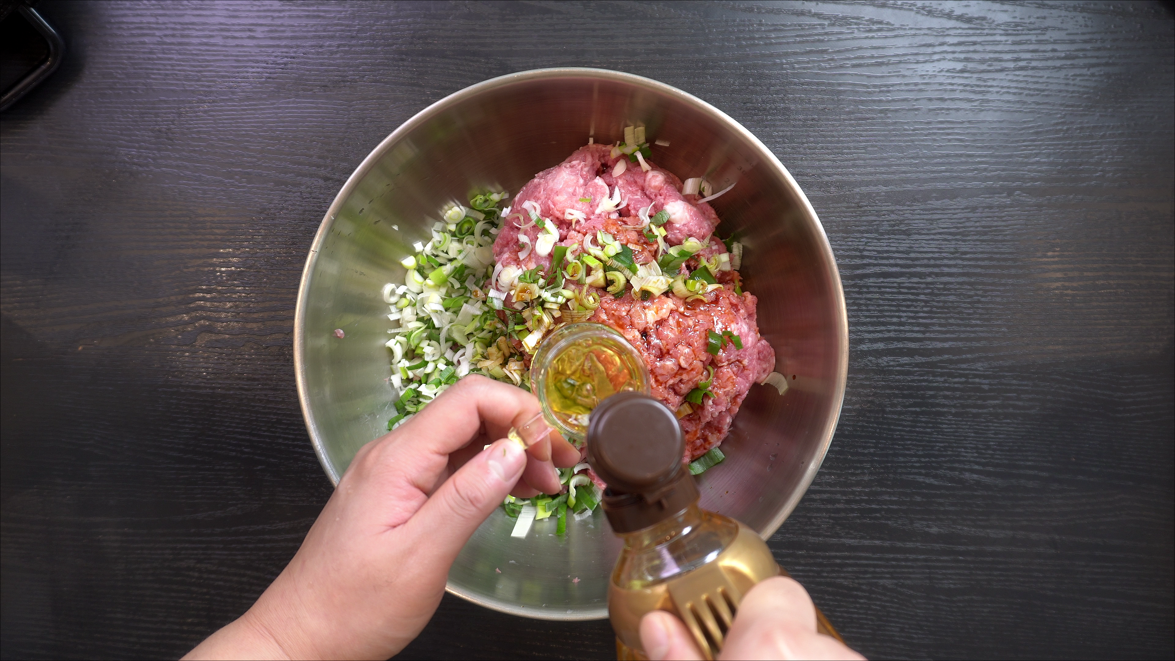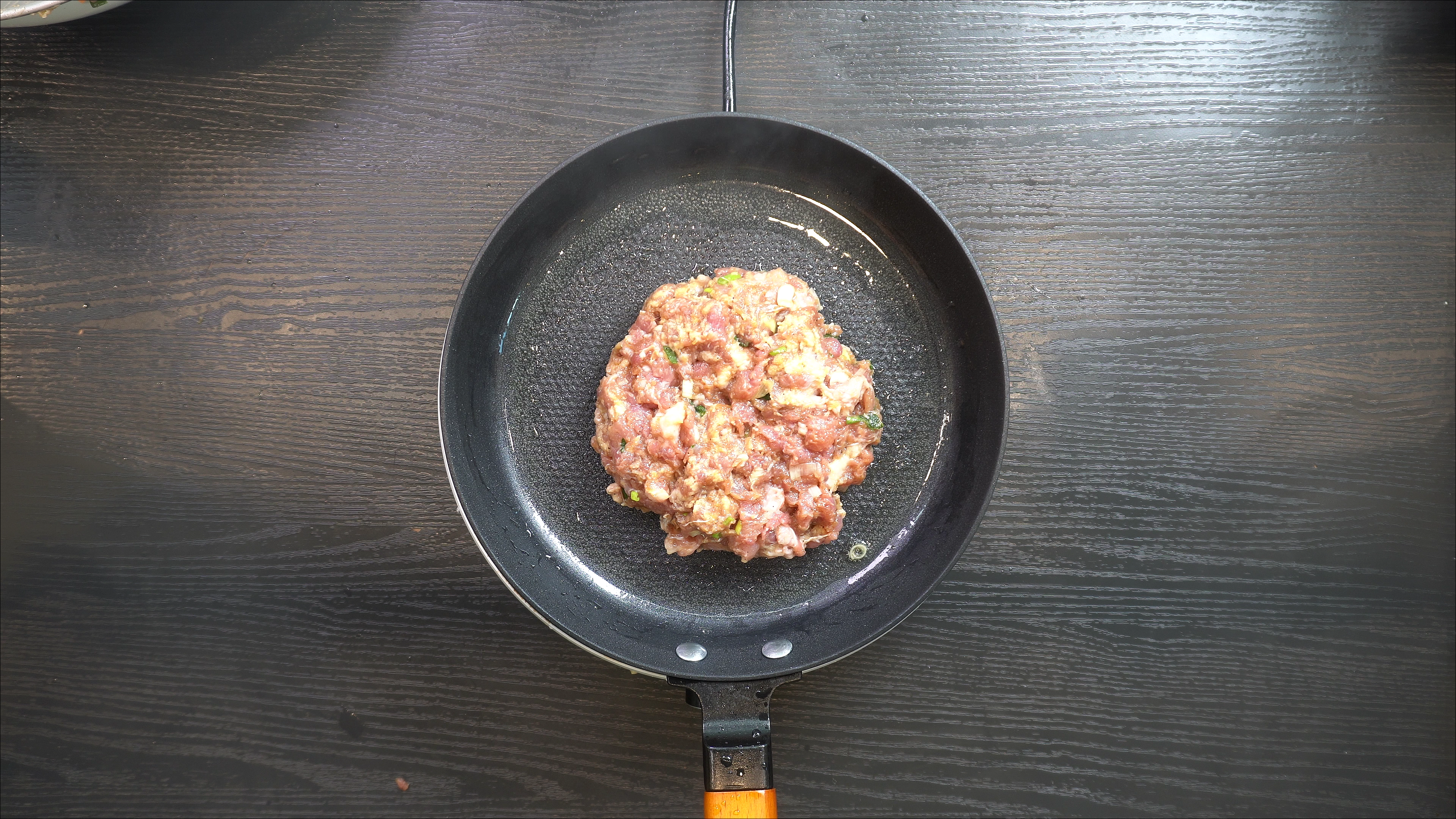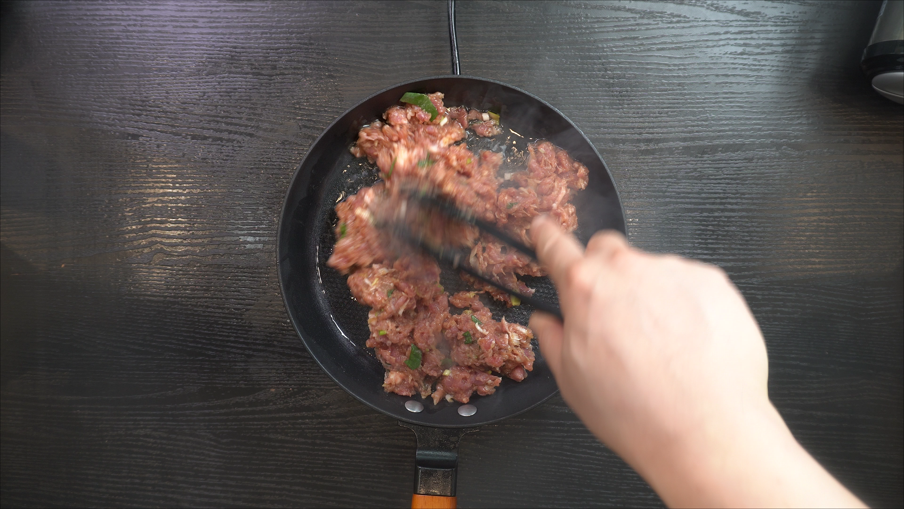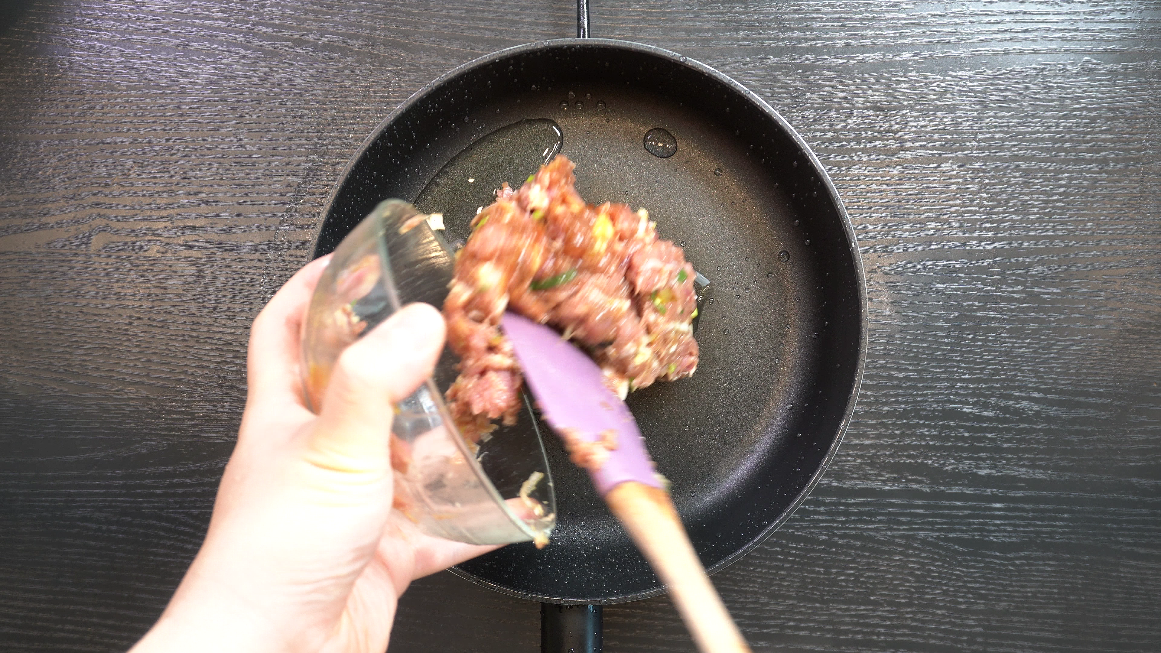 1. 팬에 식용유를 두르고 다진 돼지고기를 넣고 볶는다.