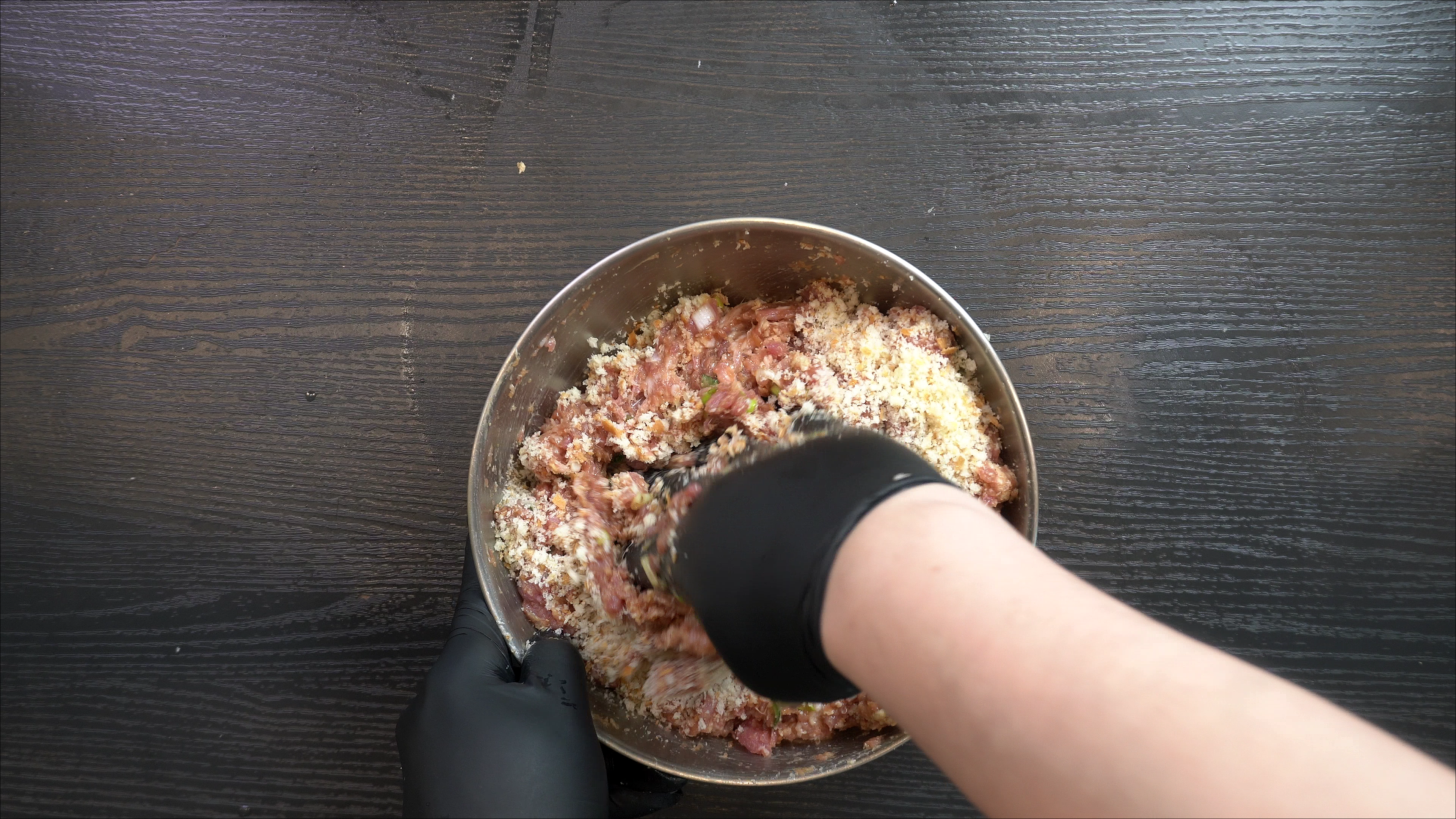 1. 다진 돼지고기 반죽 1kg 에 빵가루 130g 을 넣고 섞는다.
