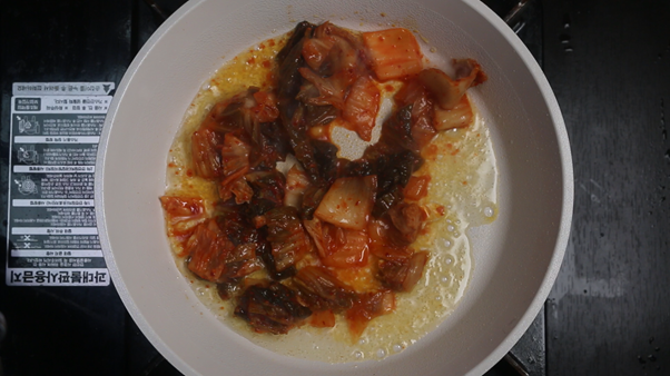 1. 후라이팬에 식용유 2숟가락을 넣고 한입크기로 자른 김치 한 컵을 넣고 살짝 볶아준다. 신김치를 사용할 경우 설탕을 1/2숟가락~1/3숟가락 정도 넣어서 신김치 특유의 신맛과 군내를 잡아준다.
