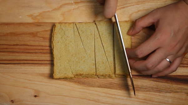 3. 냉동 돈가스 1개를 에어후라이어 또는 기름에 튀겨 한입크기로 잘라 준비한다. 집에 먹다 남은 돈가스가 있다면 데워질 정도로만 에어후라이어나 기름에 튀겨준다.
