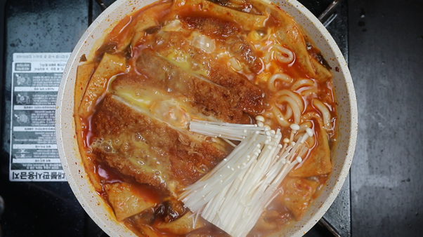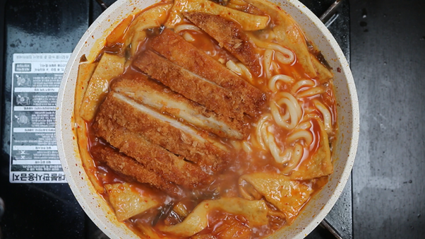 7. 미리 튀겨둔 냉동 돈가스를 먹기 좋은 크기로 잘라 김치우동 위에 올리고 계란물 한 개를 풀어서 돈가스 위에 부어준다.