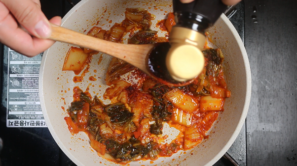 2. 고춧가루 1숟가락, 진간장 1숟가락을 넣고 김치 숨이 다 죽을 때 까지 완전히 볶아준다. 고춧가루와 간장은 계속해서 숟가락 등으로 저어주지 않으면 쉽게 타므로 타지 않을 정도의 불로 (약~중불) 잘 섞어준다.