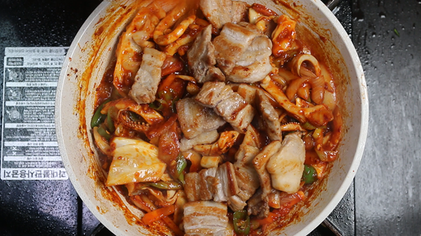 5. 오징어가 거의 다 익었으면 구워놓았던 삼겹살을 넣고 잘 섞어준다.
