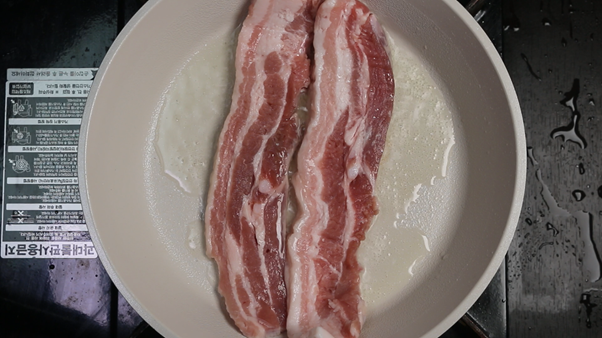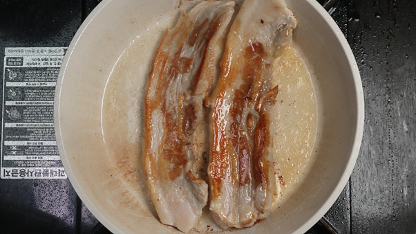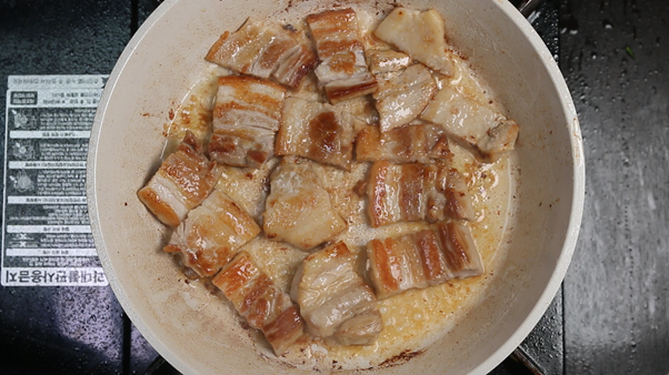 1. 팬에 식용유를 1~2숟가락 두르고 삼겹살 300g (약 2줄)을 앞뒤로 노릇하게 구워준다. 노릇하게 구워지면 한입크기로 잘라 따로 빼서 준비해둔다.