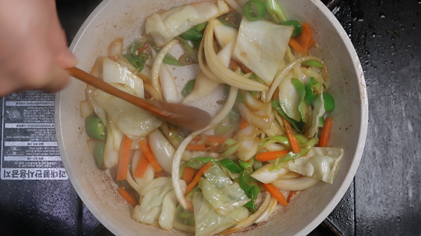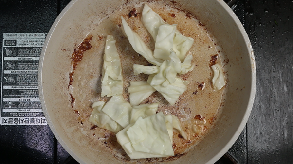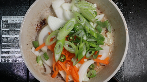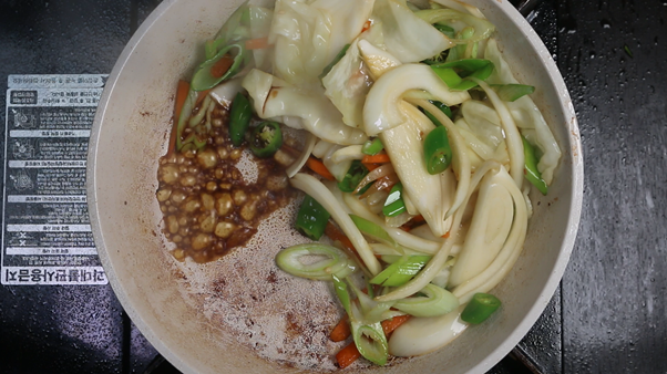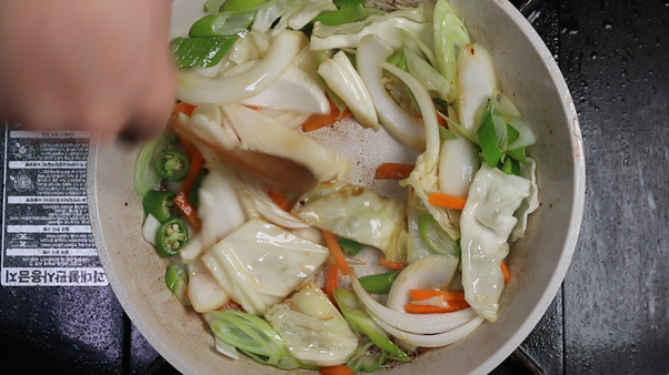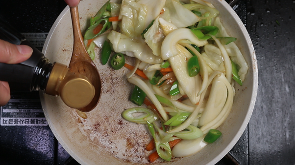 3. 채소를 팬의 한쪽으로 몰아 빈 공간을 만든 뒤 진간장 1숟가락을 넣고 간장이 살짝 타는 냄새가 나며 보글보글 끓어오르면 채소와 함께 섞어 볶아준다. 간장이 팬에 눌어붙으면서 불향과 같은 깊고 진한 향을 낼 수 있다.