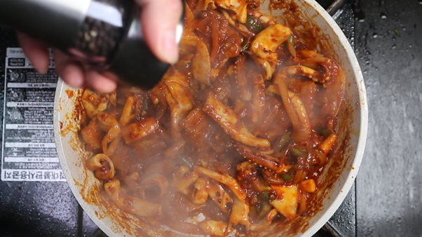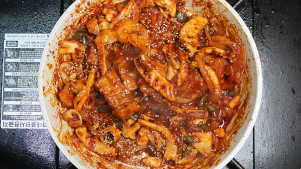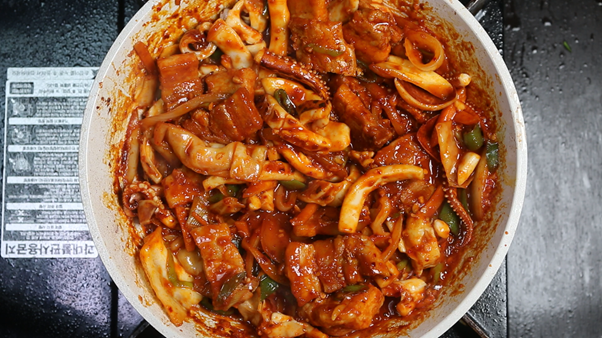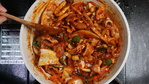 4. 양념에 재워둔 오징어를 넣고 센불에서 채소와 함께 잘 섞어가며 볶아준다. 오징어를 너무 오랫동안 익히면 질겨질 수 있으므로 센불에서 빠르게 약 3분간 익혀서 쫄깃한 식감을 유지하는 것이 중요하다.
