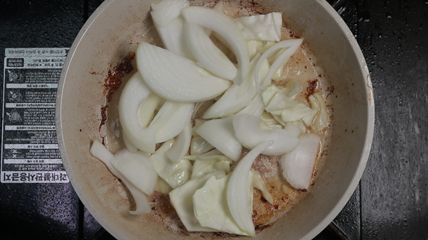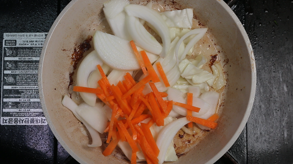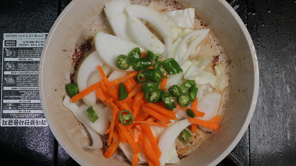 2. 삼겹살을 구운 팬에 삼겹살을 굽고 남은 고기기름을 이용해서 손질한 채소를 모두 한번에 넣고 살짝 볶아준다. 양배추 1/5통, 양파 1/2개, 당근 1/5개, 청양고추 2개, 대파 1/2대를 모두 넣고 기름에 볶아준다. 이 외에도 버섯 등 집에 남아있는 채소가 있다면 한입크기로 썰어 같이 넣어주면 더욱 풍성한 맛을 낼 수 있다.