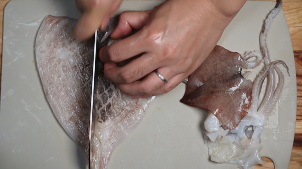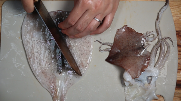 1. 오징어를 깨끗이 손질한 뒤 몸통에 격자무늬로 칼집을 내준다. 오징어는 가급적 생물 오징어를 이용해야 비릿내와 잡내 없이 깔끔하게 만들 수 있다. 칼집을 낼 때 오징어가 완전히 잘라지지 않게 칼을 비스듬히 해서 적당히 힘조절 해주는 것이 중요하다. 칼집을 내는 과정이 귀찮을 수 있지만, 칼집 사이로 매콤한 양념이 잘 베일 뿐만아니라 볶을 때 말려서 보기 좋게 모양이 잡힌다.