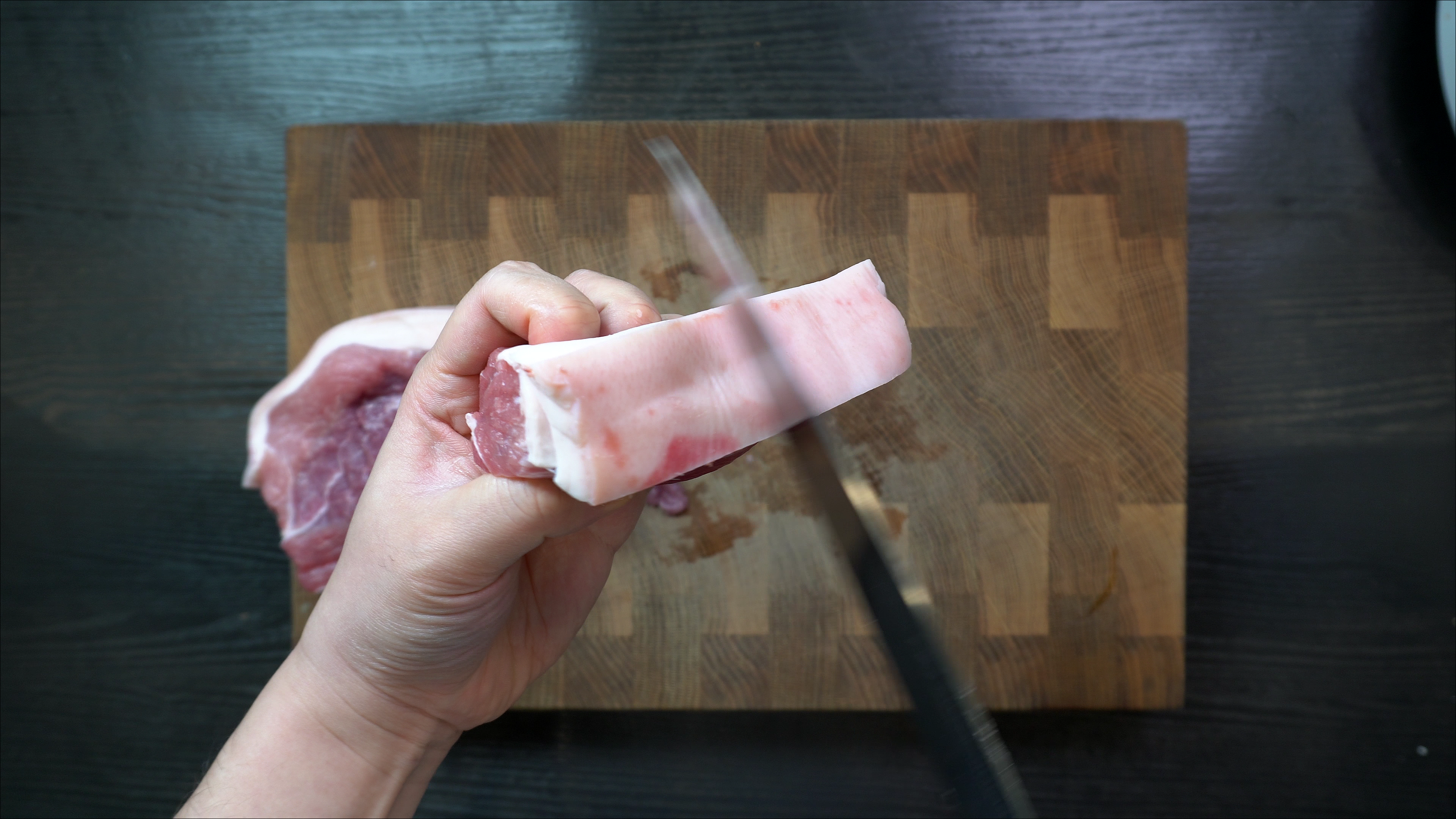 1. 앞다리살에 붙은 돼지 껍데기 부분을 칼로 긁어서 잔털과 불순물을 제거한다.