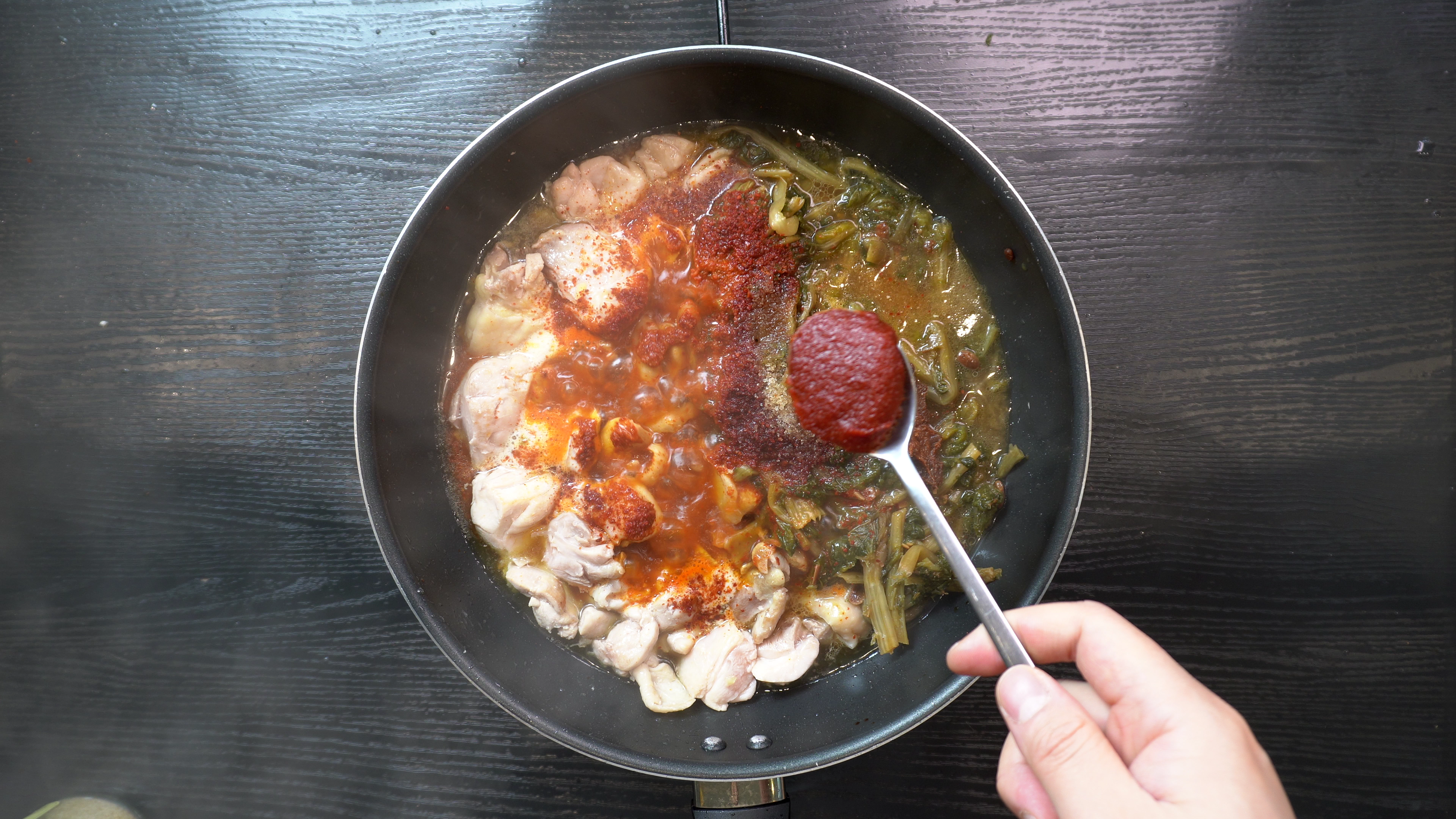 7. 당면이 익으면 불을 끄고 탈피 들깨가루 뿌려주면 시래기찜닭 완성!