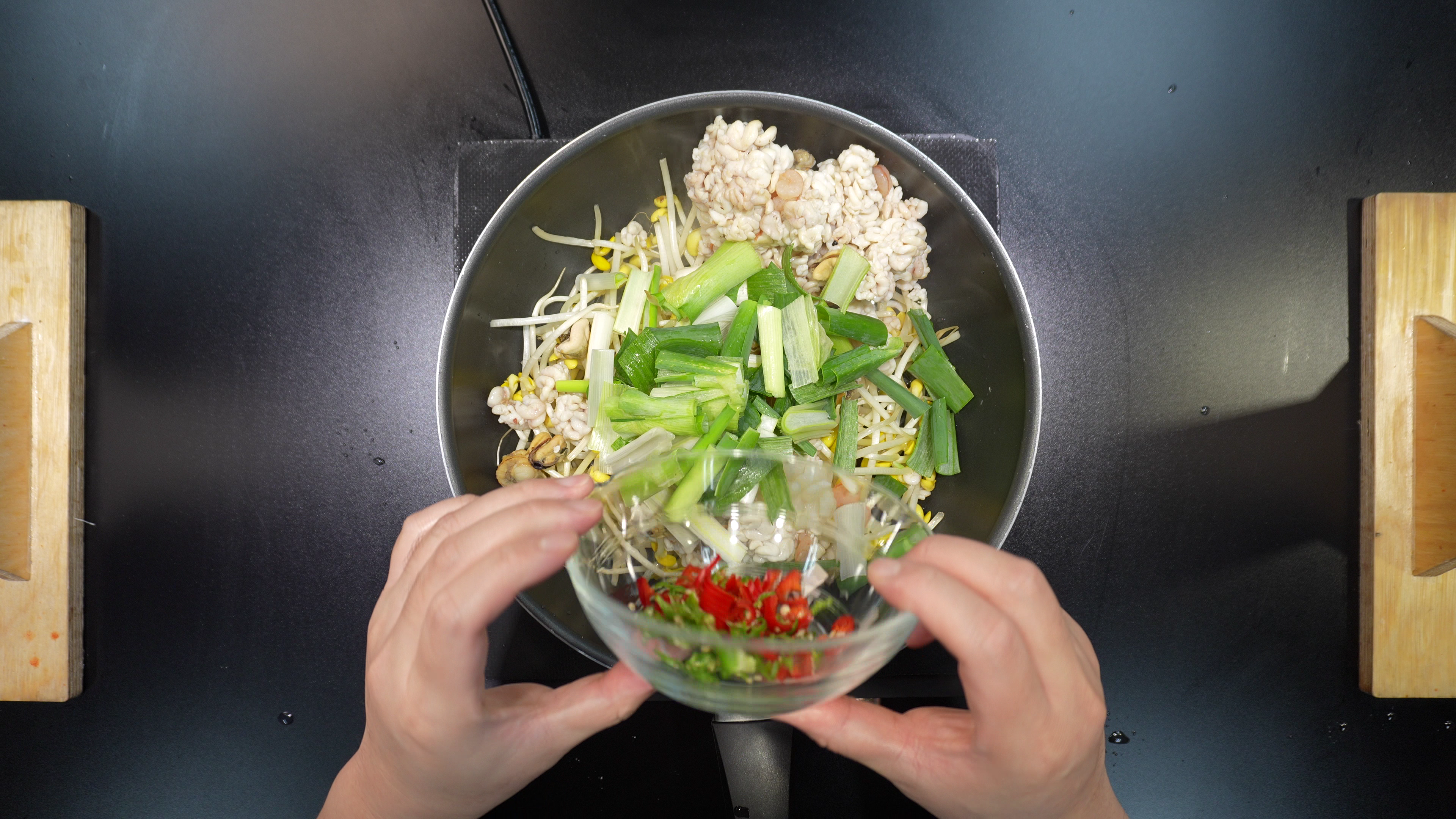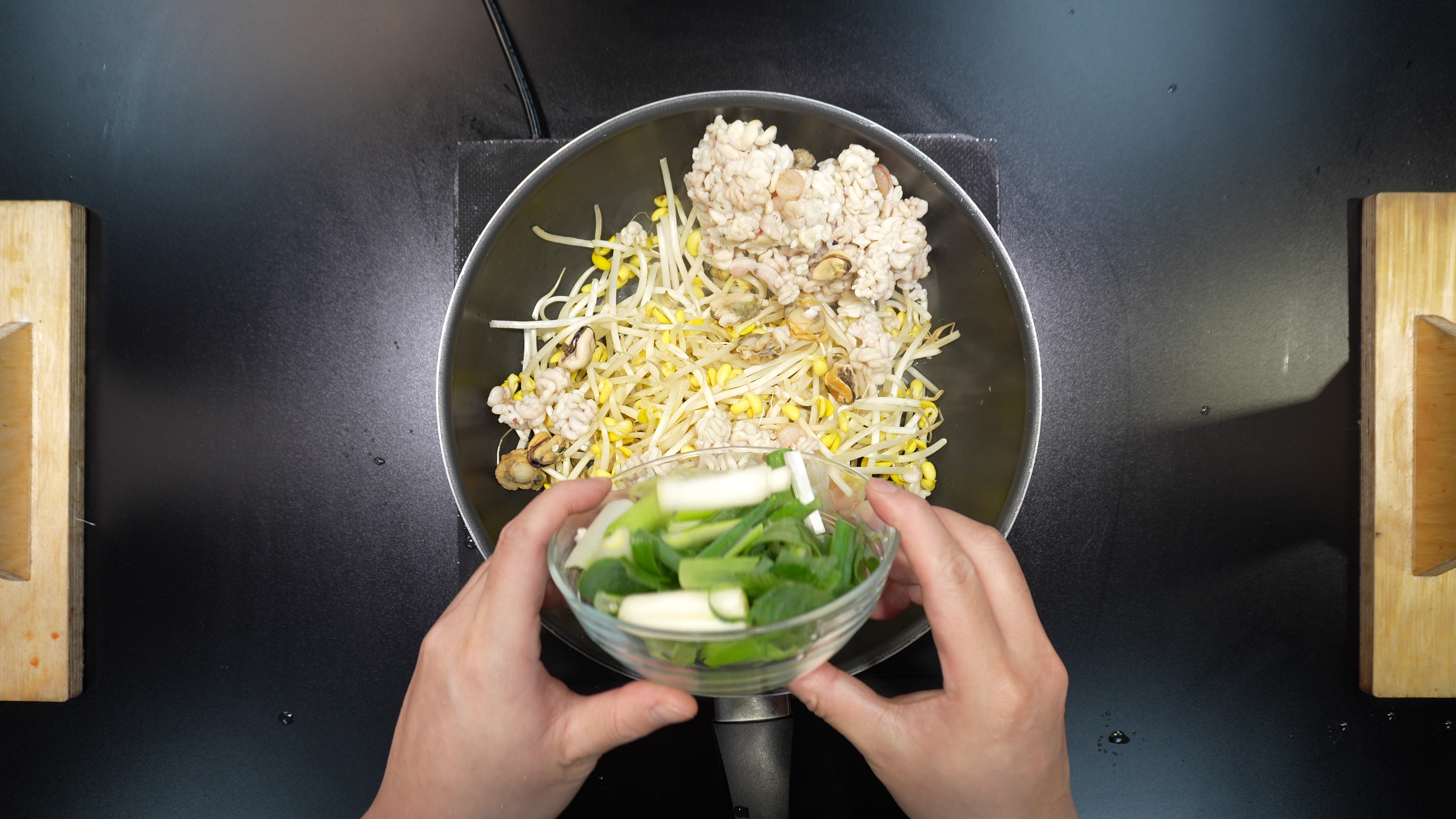 4. 팬에 아래의 재료를 넣고 데친다.