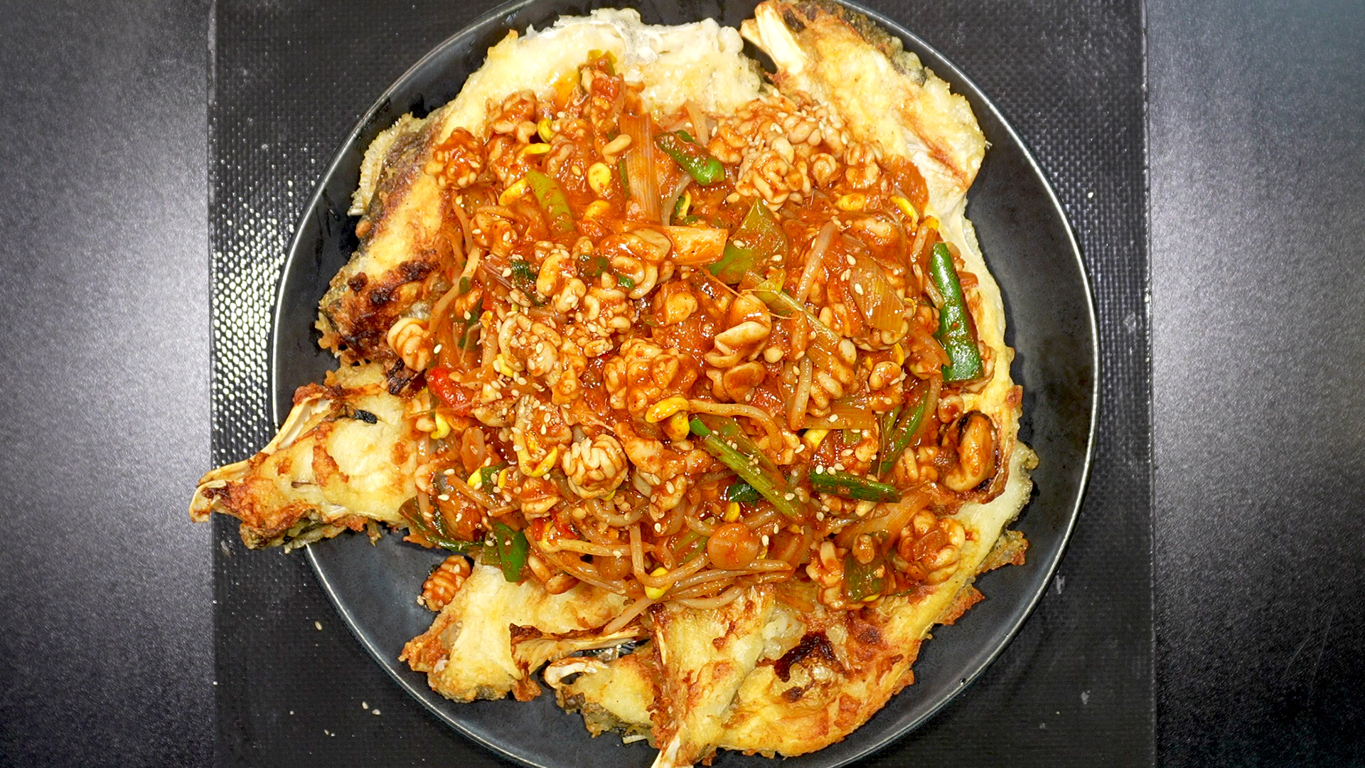7. 튀긴 대구뽈살 위에 해물찜을 듬뿍 올린 다음 아래의 재료들을 뿌려주면 완성!