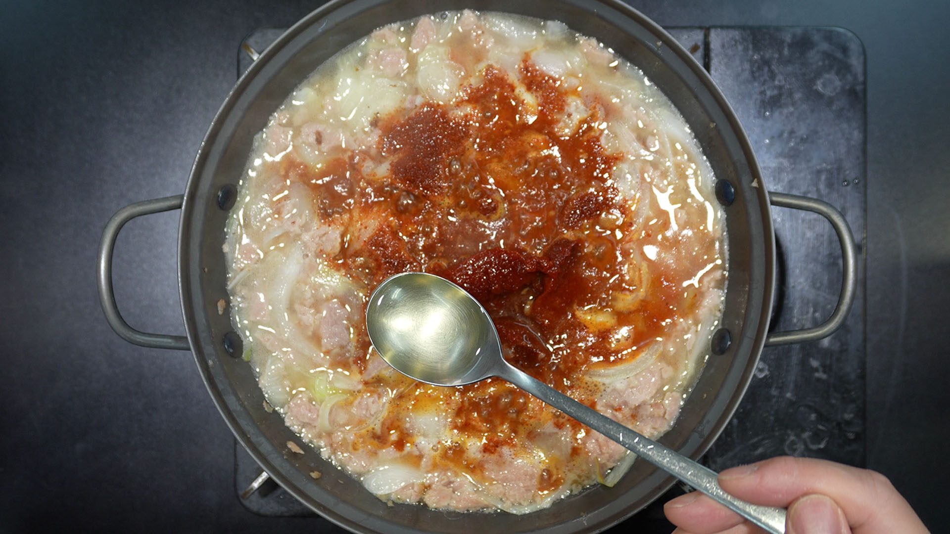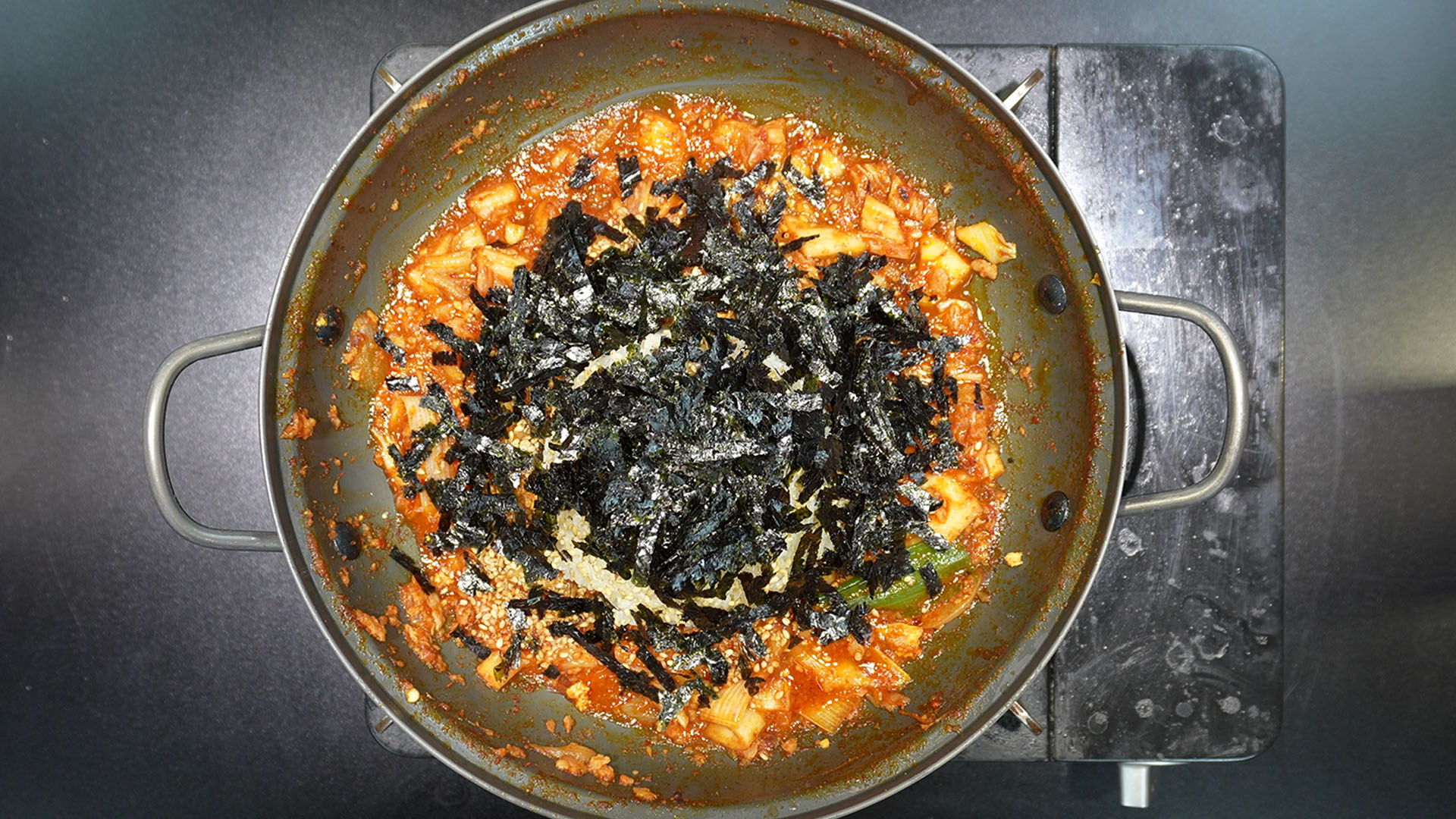1) 두루치기 국물 약간과 다진 김치를 냄비에 넣는다