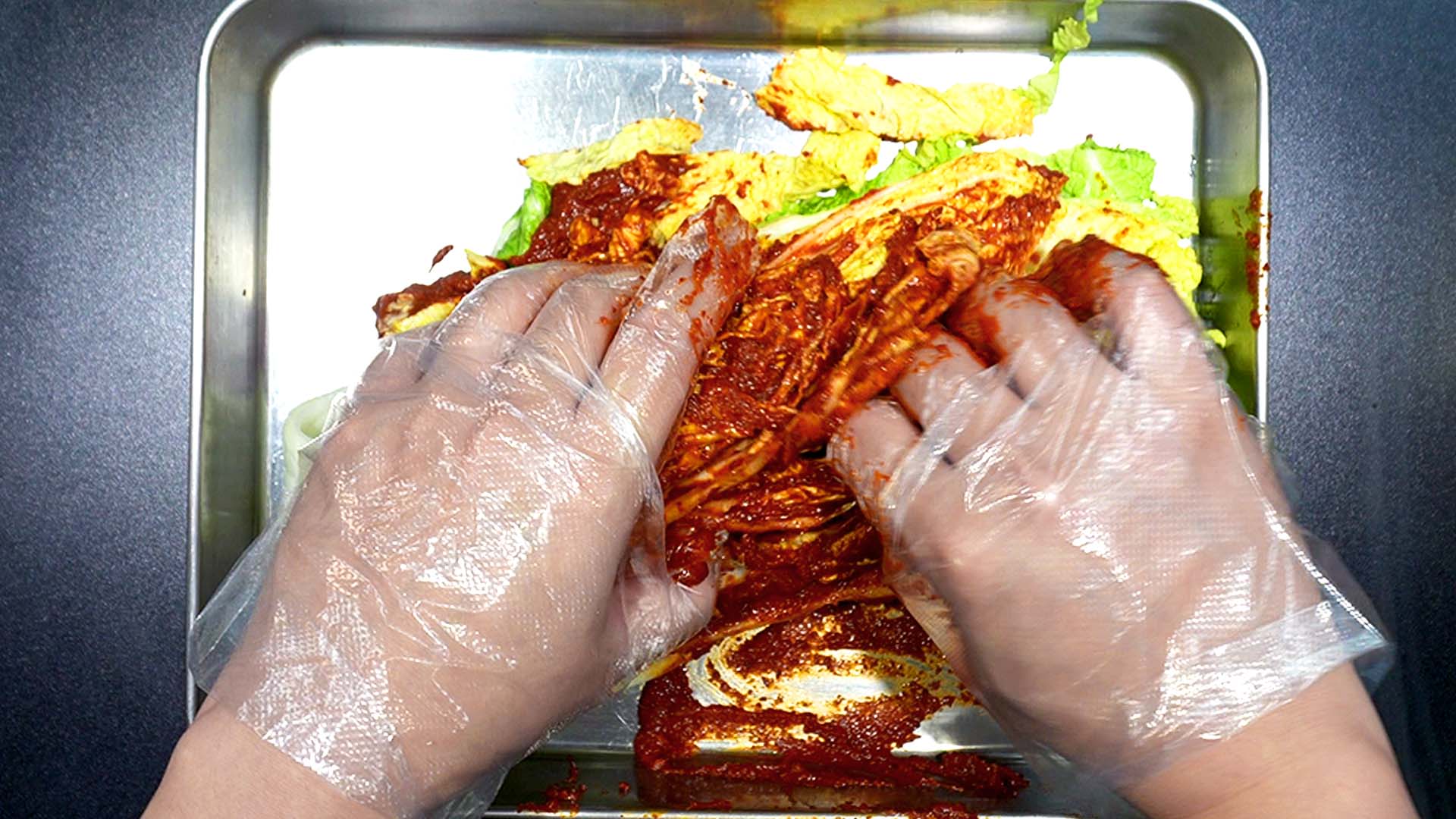 4. 절인 배추 잎 사이사이에 양념을 꼼꼼히 발라준다
