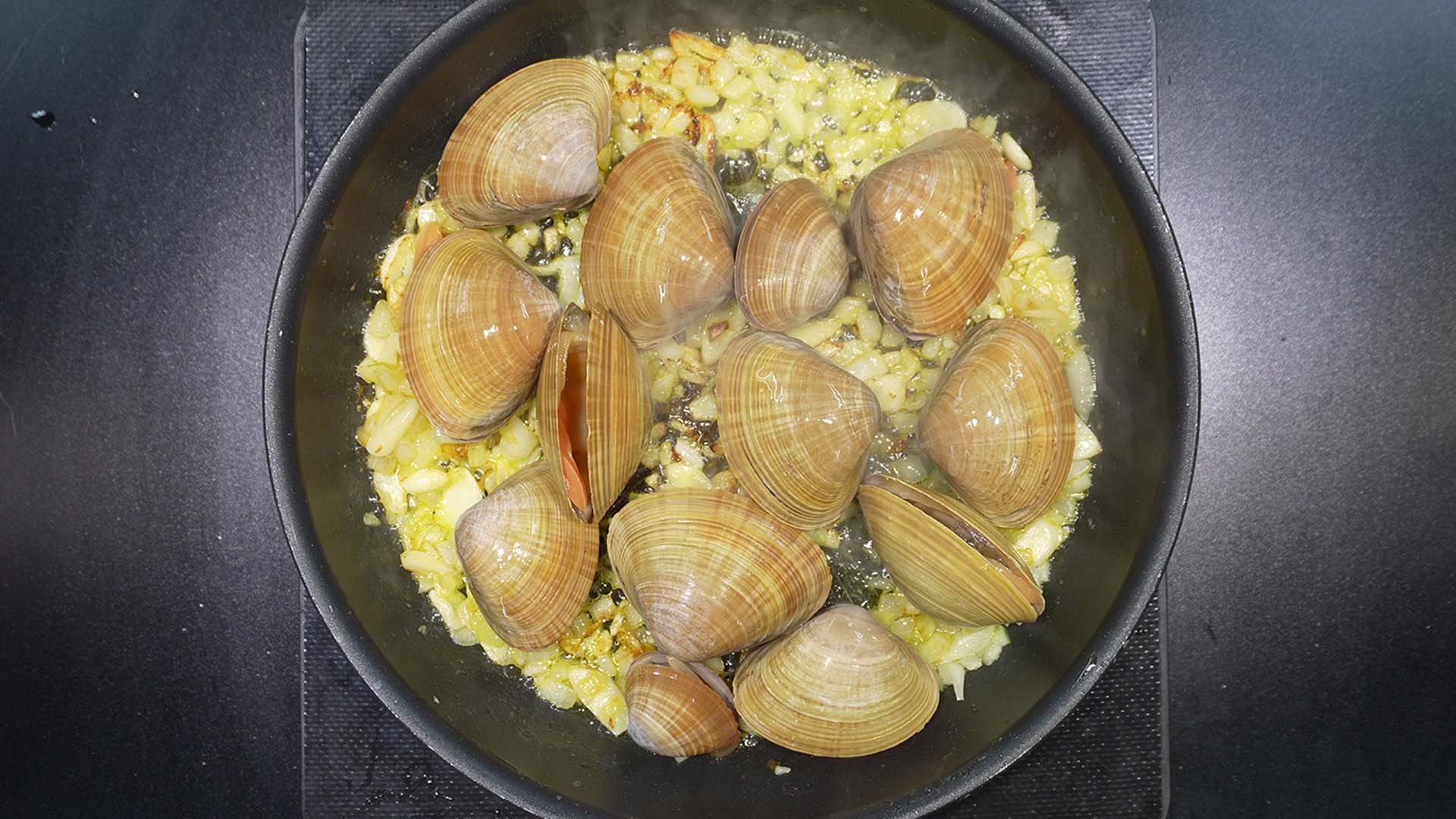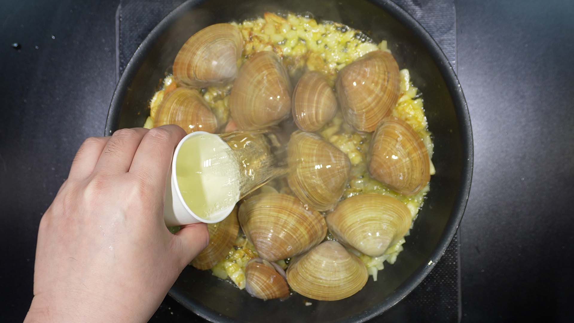 6) 명주조개를 팬에 넣어준다