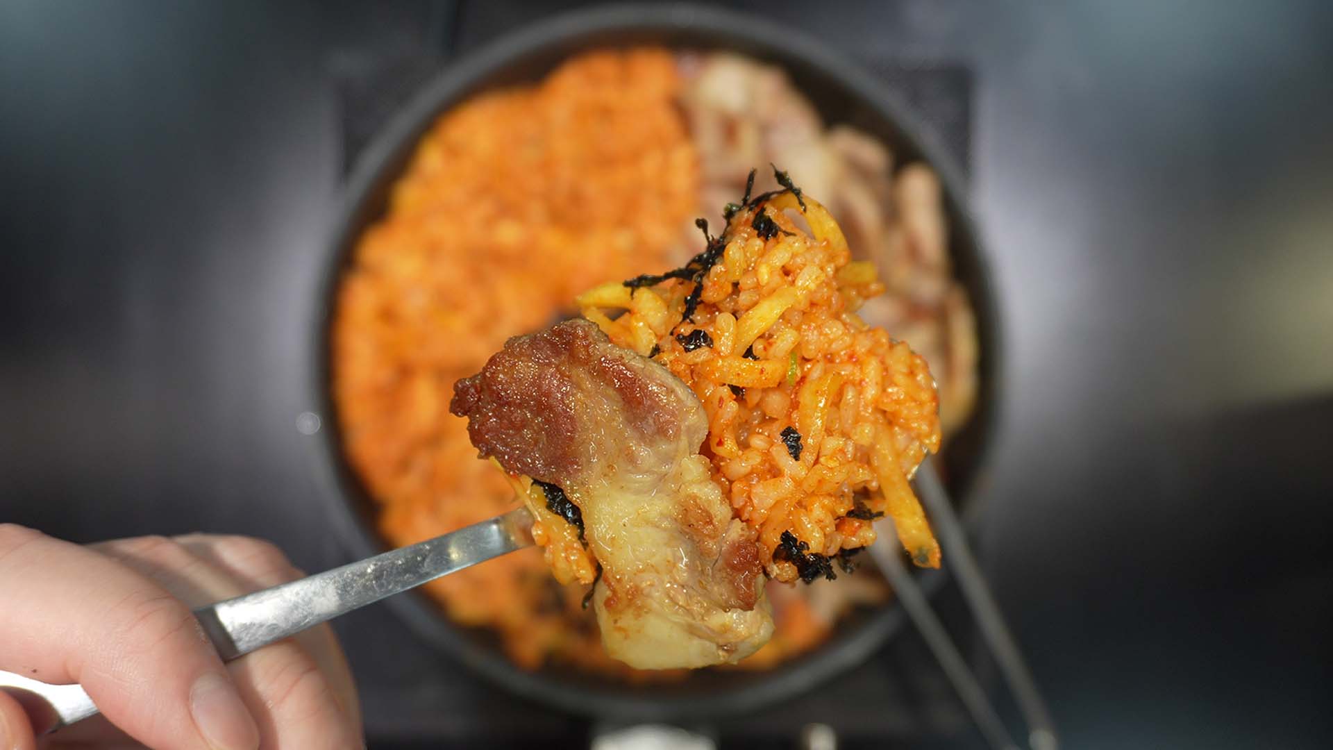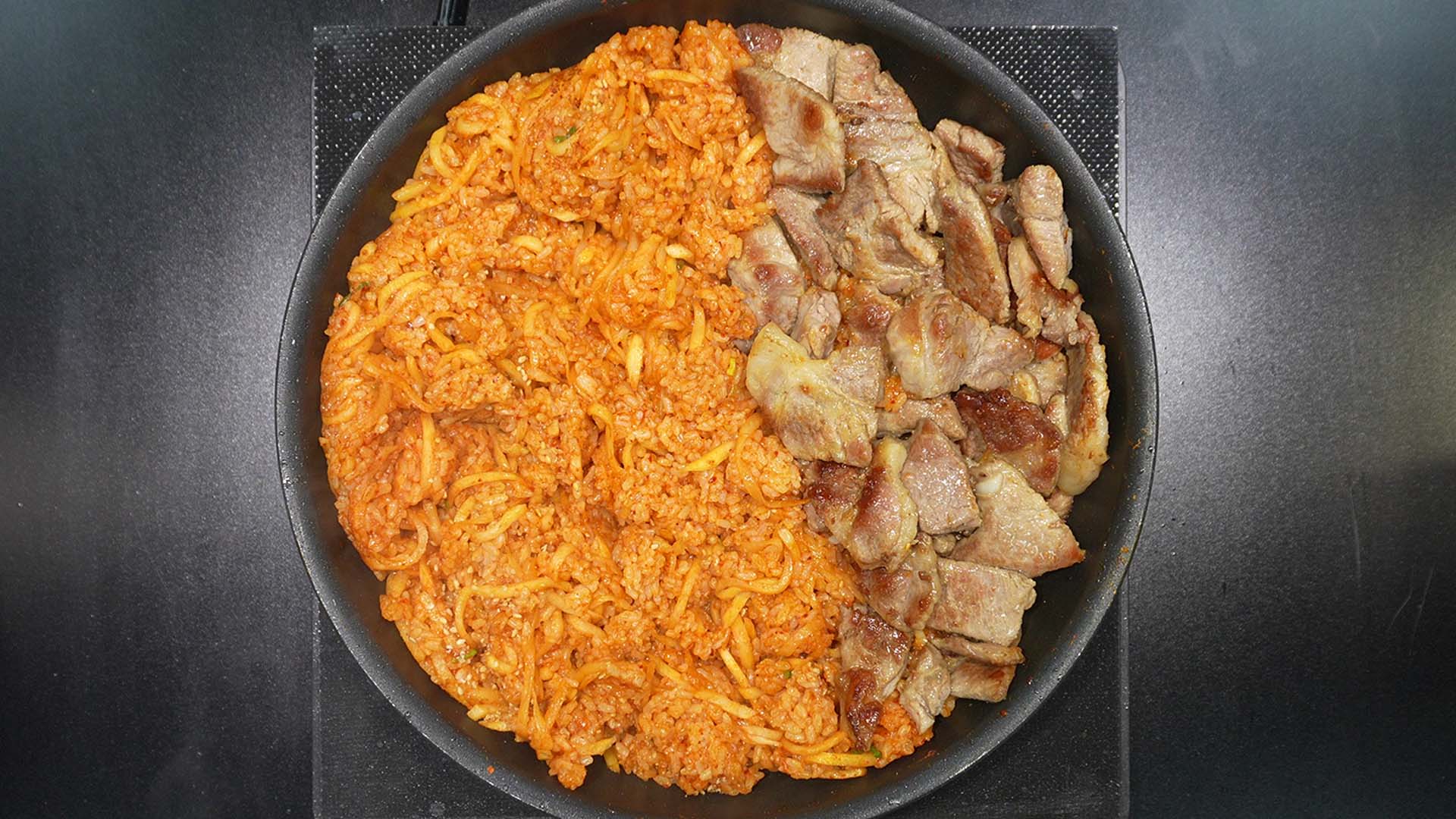 1) 목살을 구웠던 팬에 밥을 넣어준다