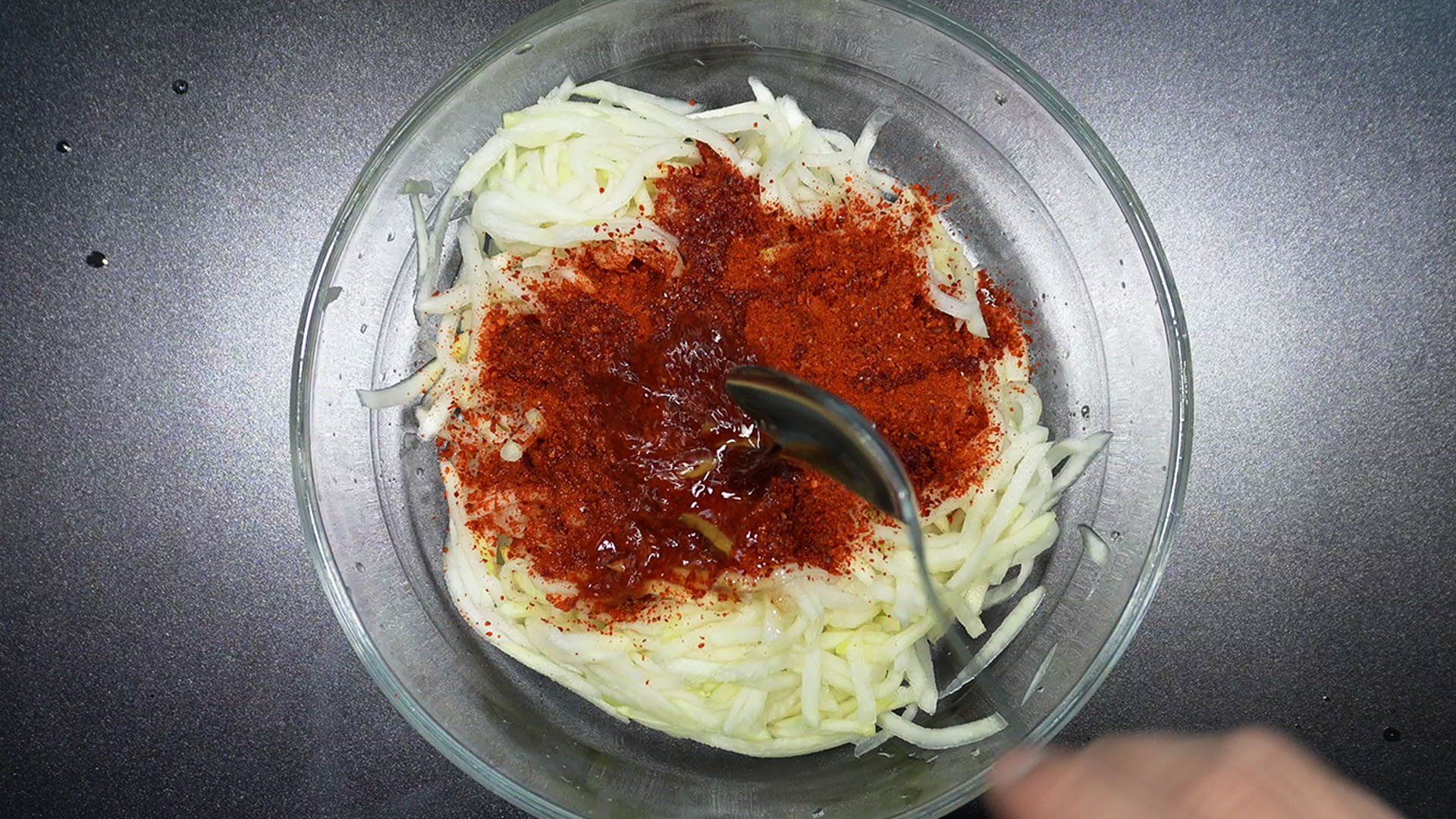 6) 물기를 빼준 무채에 고춧가루를 뿌려준다