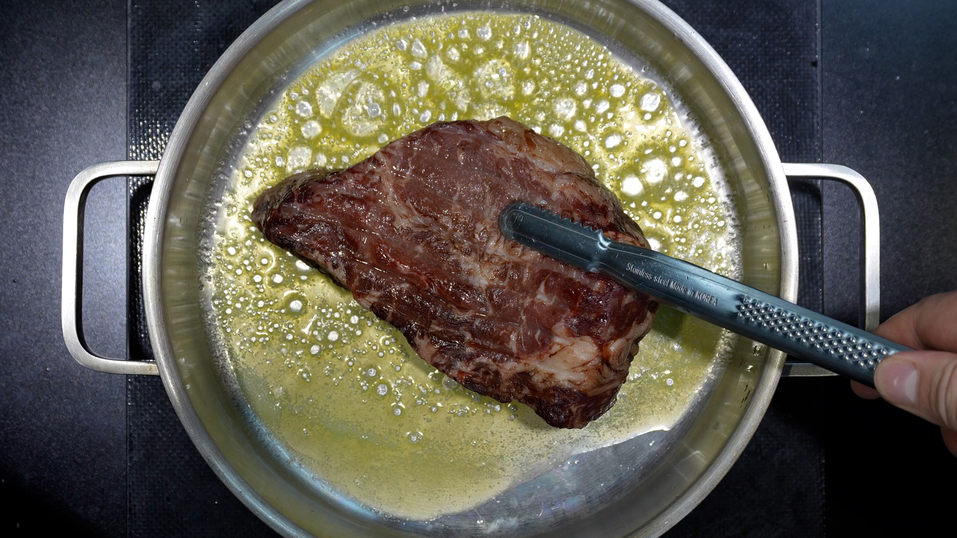 16) 버터를 녹인 후, 스테이크를 올려 굽는다.
