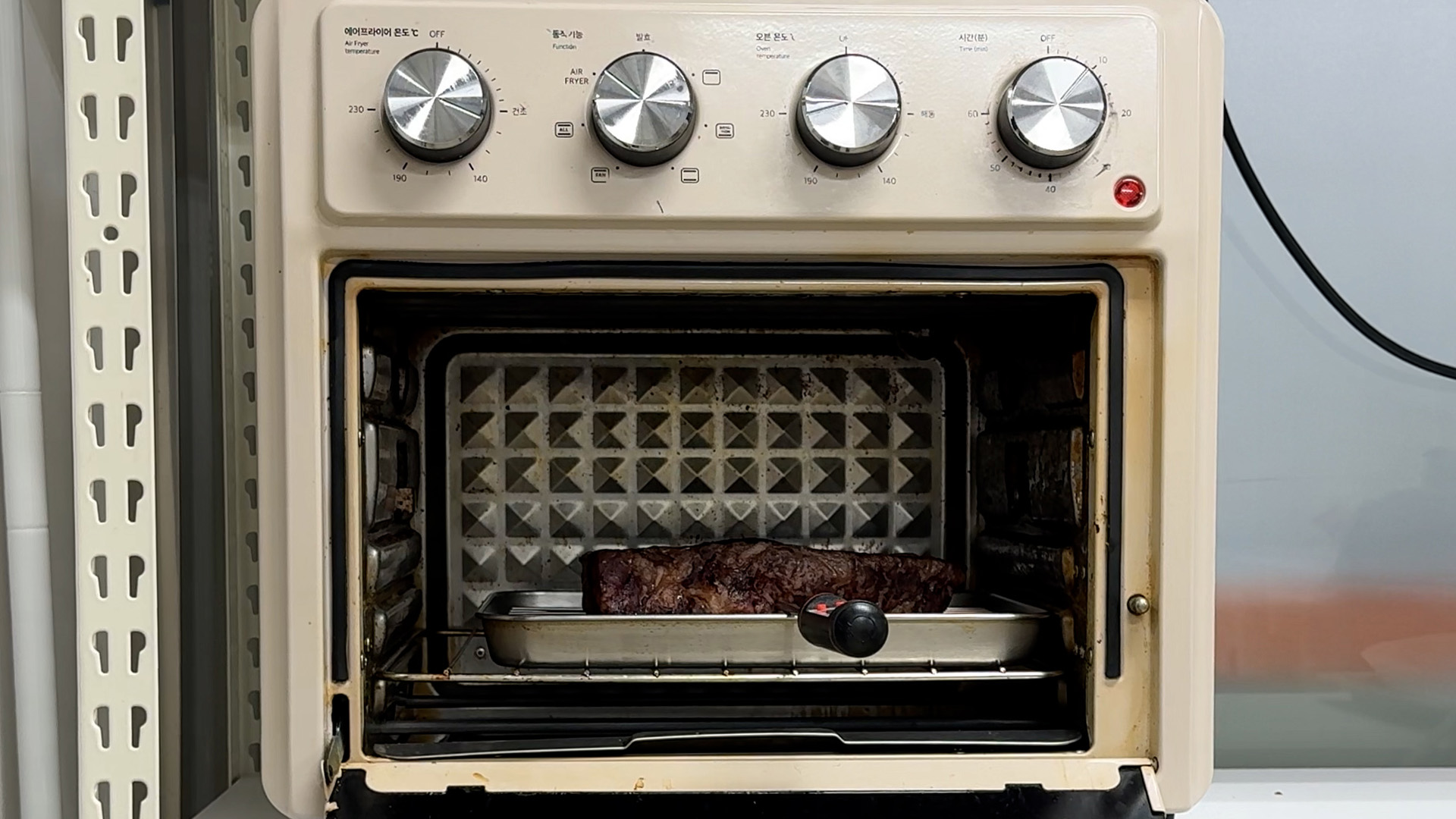 3) 가장 낮은 온도로 설정한 에어프라이어에 넣고, 고기의 내부 온도가 54도가 될 때까지 구워준다.